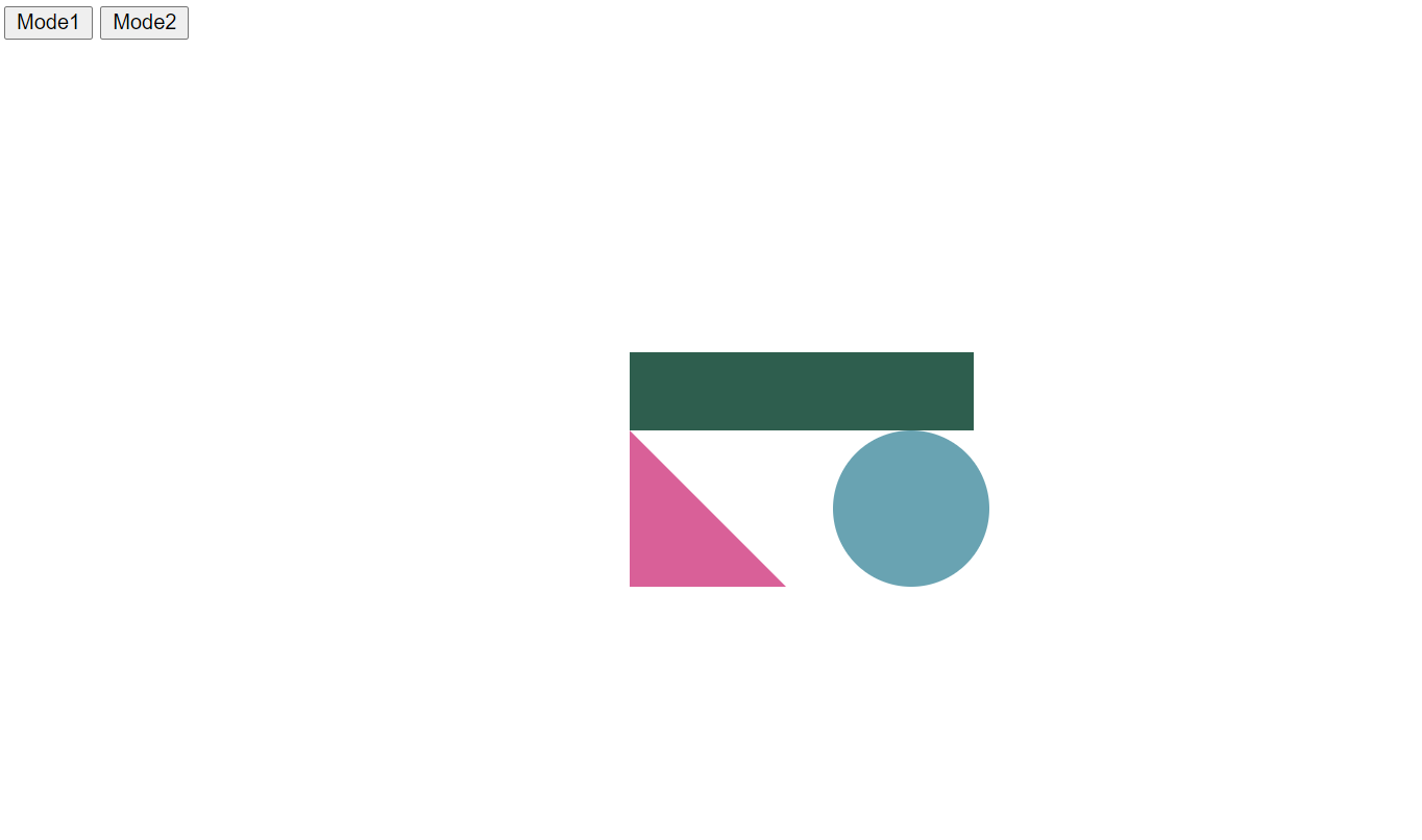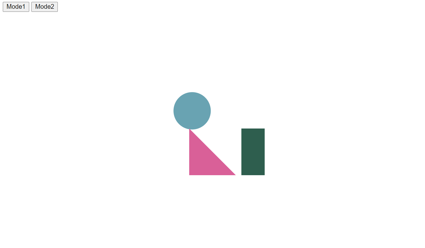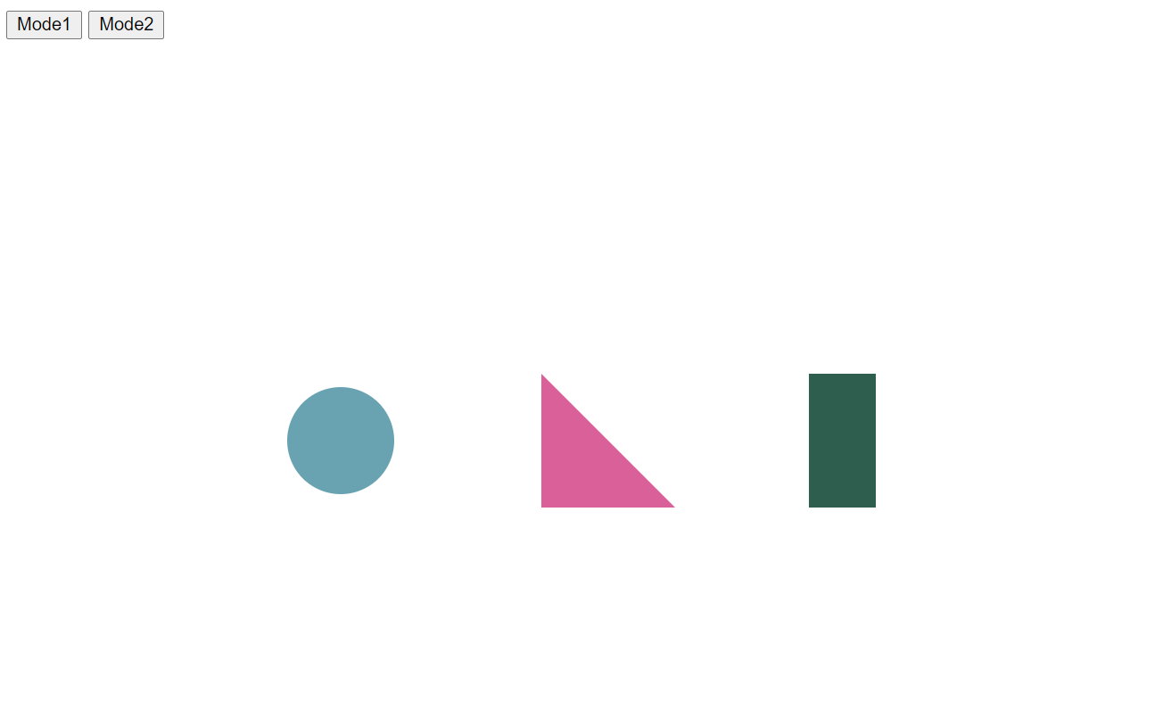 I started this project by drawing one circle, one rectangle, and one triangle made with path. I also make two buttons on the top of the page, each button will change the location of items. For aesthetic reasons, hovering on the circle or rectangle will change the color of the shapes to different color palettes.