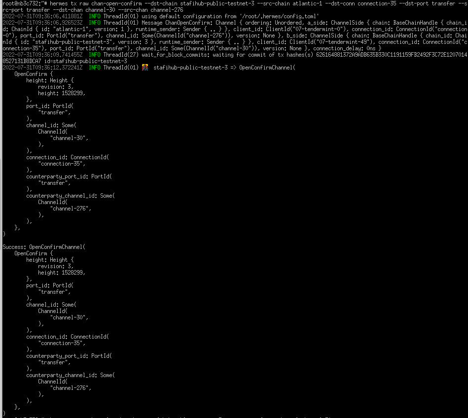 hermes tx raw chan-open-confirm --dst-chain stafihub-public-testnet-3 --src-chain atlantic-1 --dst-conn connection-35 --dst-port transfer --src-port transfer --dst-chan channel-30 --src-chan channel-276