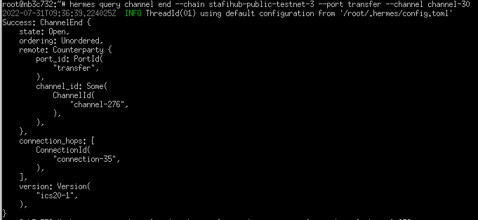 hermes query channel end --chain stafihub-public-testnet-3 --port transfer --channel channel-30