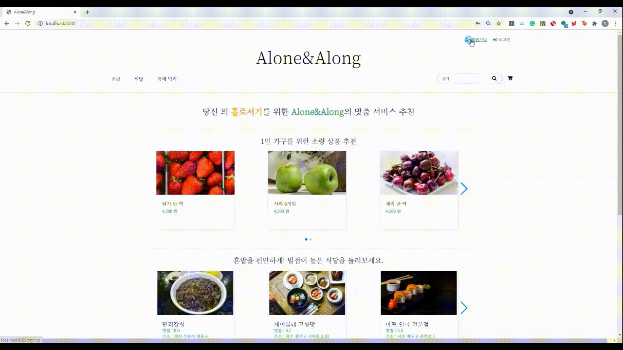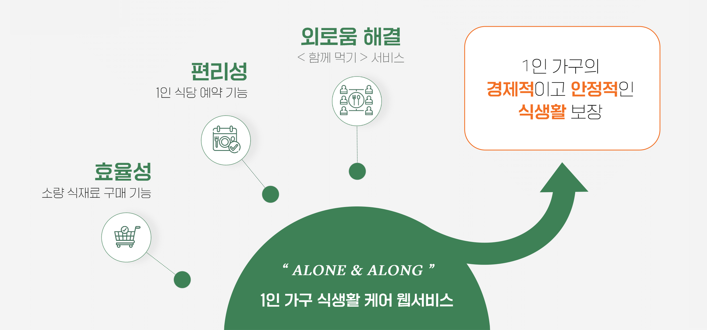 1인 가구 식생활 케어 웹서비스 ‘Alone & Along’은 이러한 문제를 해결하기 위해 개발되었다. 해당 서비스를 통해 사용자들은 소량의 식재료를 구매하여 효율적인 소비가 가능해지고, 1인 식사가 보장된 식당을 예약하여 보다 편리한 식생활을 할 수 있으며, 함께 먹기 서비스를 통해 1인 가구의 주된 어려움 중 하나인 외로움을 조금이나마 해결할 수 있다.