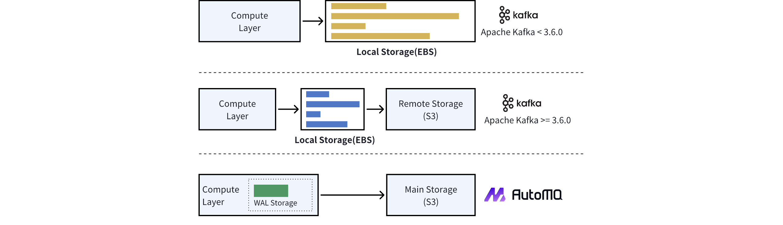 AutoMQ employs object storage as its primary storage method, without the concept of storage tiers. However, to optimize storage efficiency, such as reducing latency for writing to object storage and improving write efficiency for large partitions, AutoMQ introduces a WAL storage mechanism. The architectural comparison is as follows: