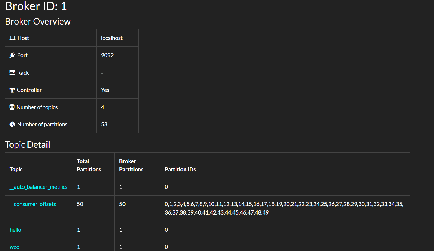 Kafdrop [1] is a sleek, intuitive, and robust Web UI tool designed for Kafka. It allows developers and administrators to easily view and manage key metadata of Kafka clusters, including Topics, Partitions, Consumer Groups, and their offsets. By providing a user-friendly interface, Kafdrop significantly simplifies the monitoring and management of Kafka clusters, enabling users to quickly obtain cluster status information without relying on complex command-line tools.