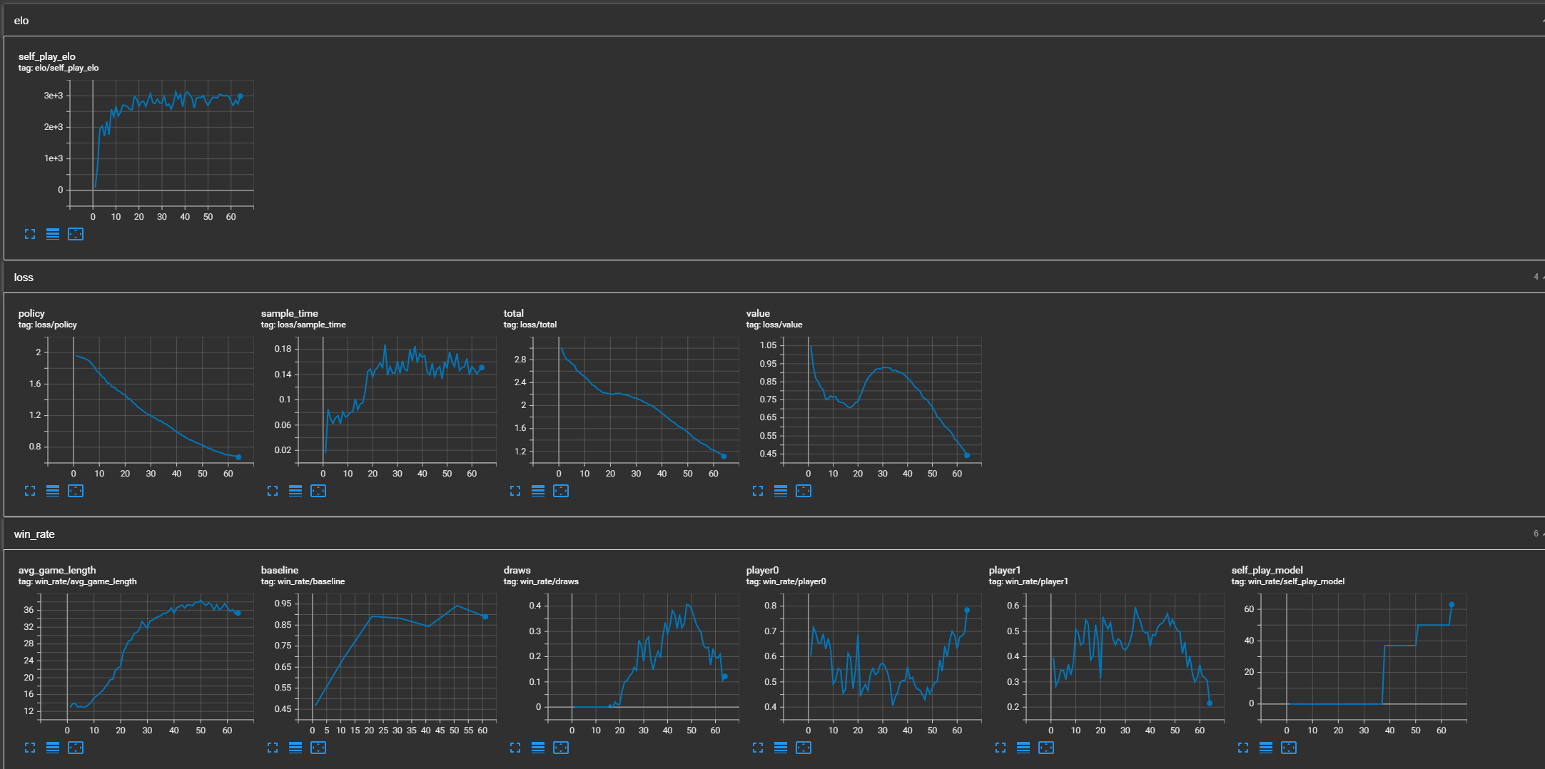 After about 60 iteration and around 24 hours of training, the agent has mastered the game. This can be shown by the fact that when the agent plays first, it wins the majority of the time. Since connect4 is solved, it has been proven that the player that plays first can always guarantee a victory. It can also beat a perfect solver if it goes first. The self-play elo curve also shows a solid increase in strength, peaking at around 3000 ELO. Here are the tensorboard logs: