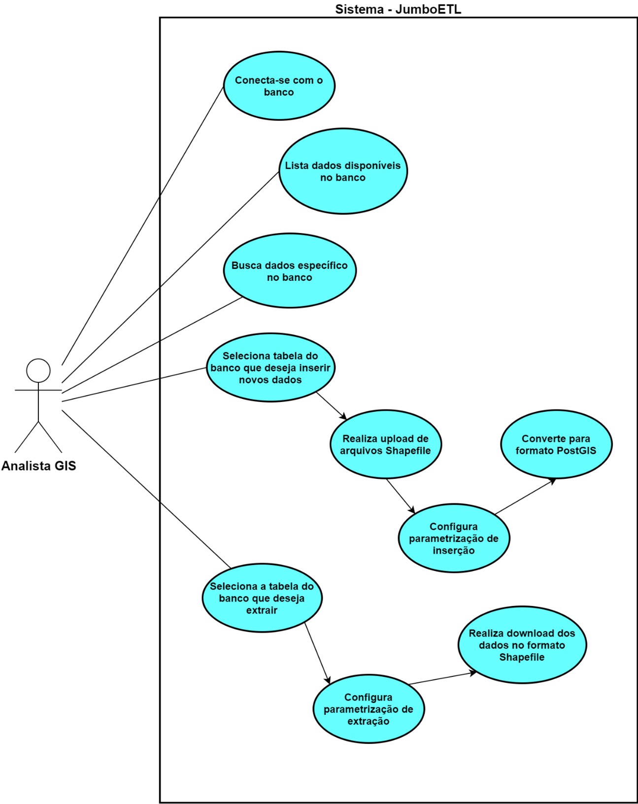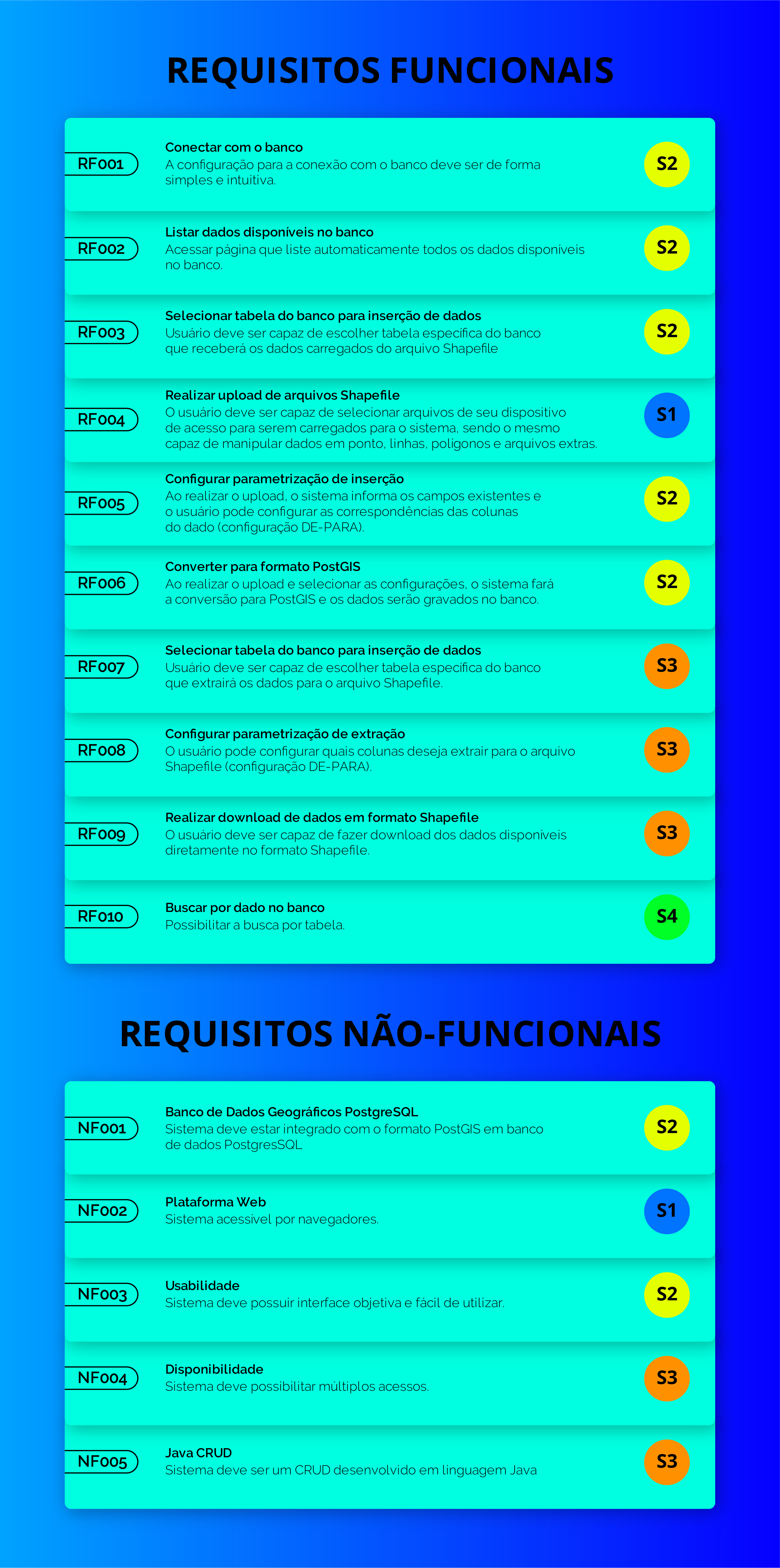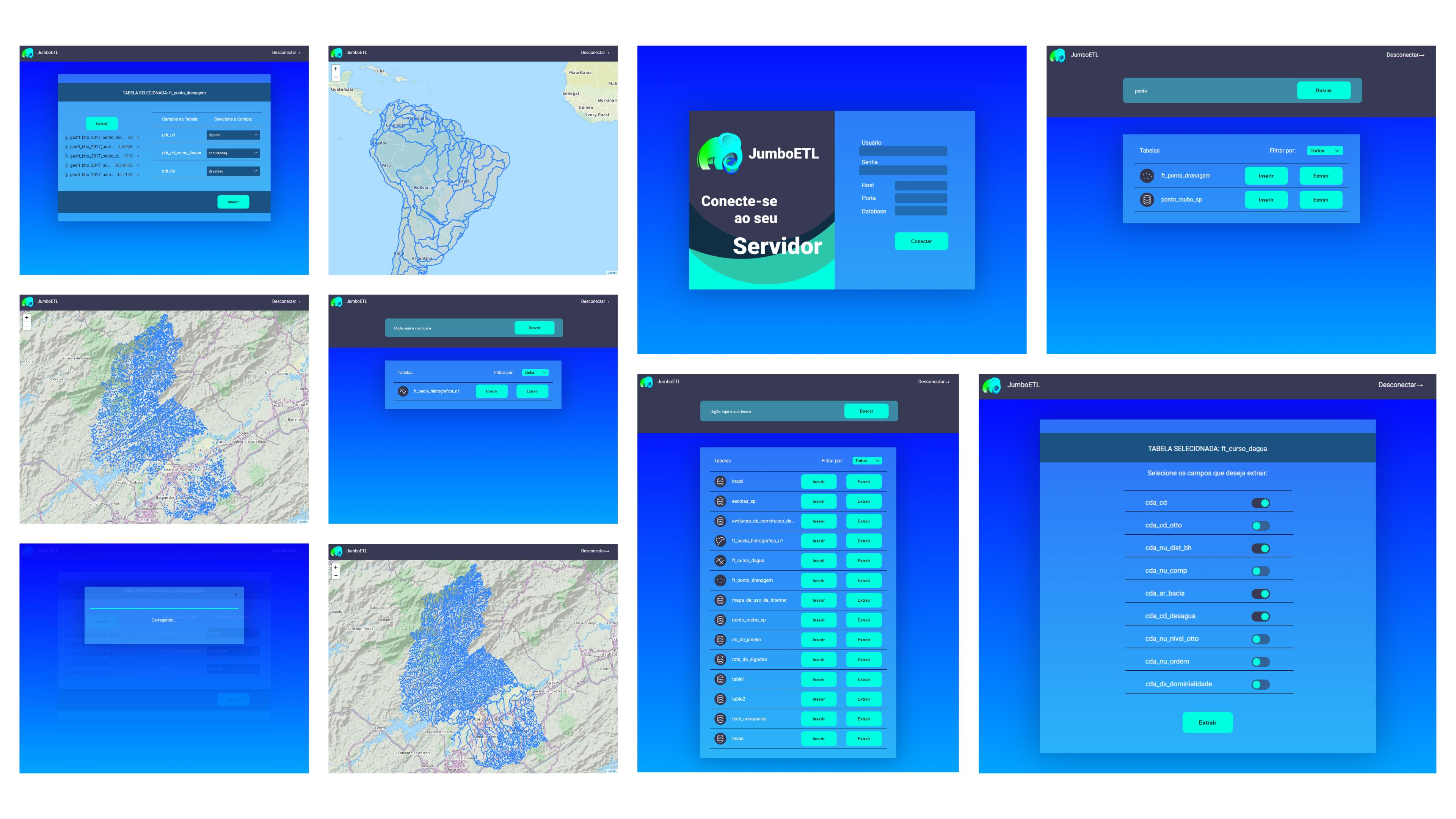 O sistema permite gerenciar os arquivos de dados georreferenciados no formato Shapefile, junto ao Banco de Dados. Ele utiliza a ferramenta de software ETL que compõem três etapas (extração, transformação e carregamento) e possui interface gráfica de usuário (GUI). Construído para interagir com dados georreferenciados (PostGIS/PostgreSQL), promete de maneira simples o usuário alimentar, manipular e recuperar arquivos no formato Shapefile desse banco. A aplicação oferece disponibilidade e a conveniência de rodar em qualquer dispositivo com suporte a navegadores web.