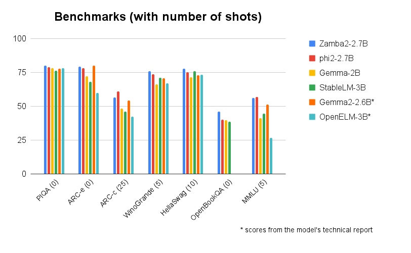 Zamba2-2.7B is a hybrid model between state-space models and transformers. It broadly follows the Zamba architecture which consists of a Mamba backbone alternating with shared transformer blocks. Zamba-2-2.7B possesses three major improvements over Zamba1: