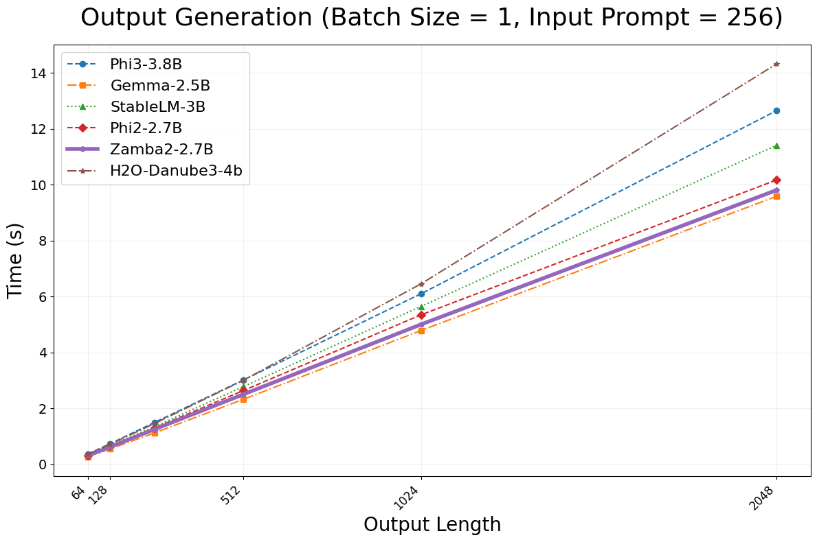 Zamba2-2.7B achieves leading and state-of-the-art performance among models of <3B parameters and is competitive with some models of significantly greater size. Moreover, due to its unique hybrid SSM architecture, Zamba2-2.7B achieves extremely low inference latency and rapid generation with a significantly smaller memory footprint than comparable transformer based models.