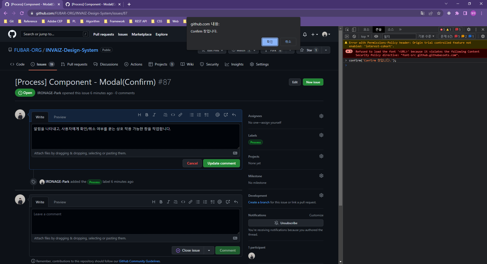 알림을 나타내고, 사용자에게 확인/취소 여부를 묻는 상호 작용 가능한 창을 작업합니다.