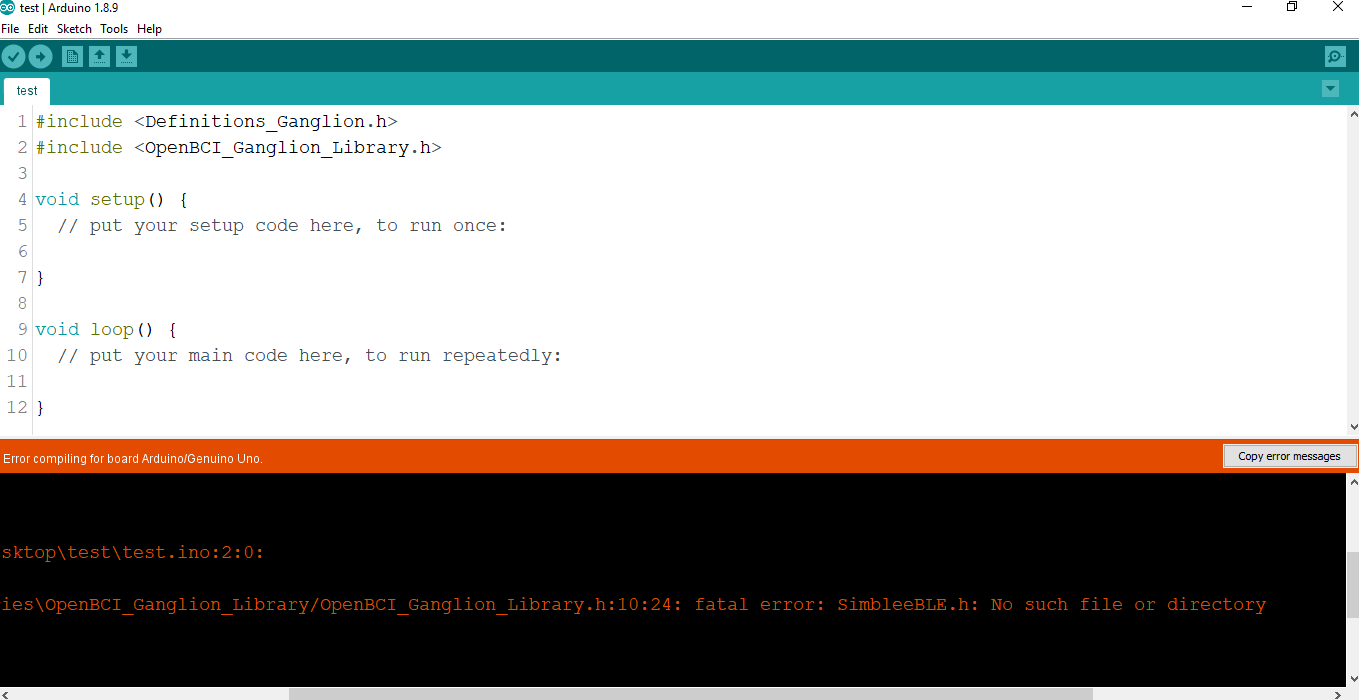 I am trying to connect the ganglion board with Arduino UNO and when I upload the library to the Arduino sketch I cant found "SimbleeBLE.h" and I need to know how I can install it, then I got these errors in the picture: