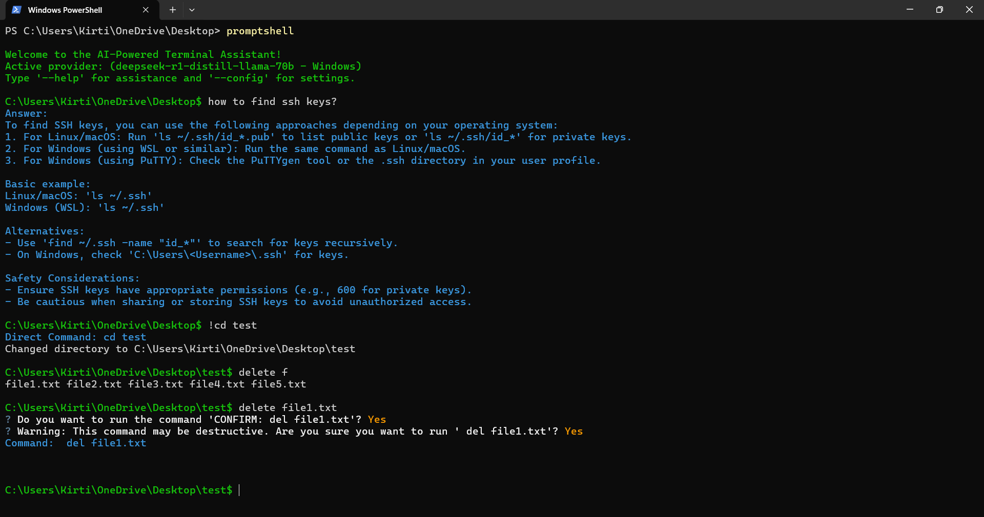 π€Direct Execution & Queries: Directly execute shell commands with '!' (e.g., !ls -la), or Ask shell-related questions using '?' (e.g., How do I create a new SSH key?).