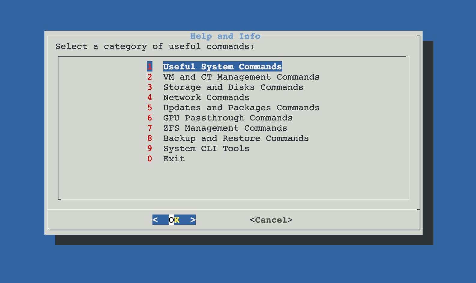 This tool offers users a quick way to browse and copy useful commands for managing and maintaining their Proxmox server, all in one centralized location.Figure 1: Help and Info interactive command reference menu.