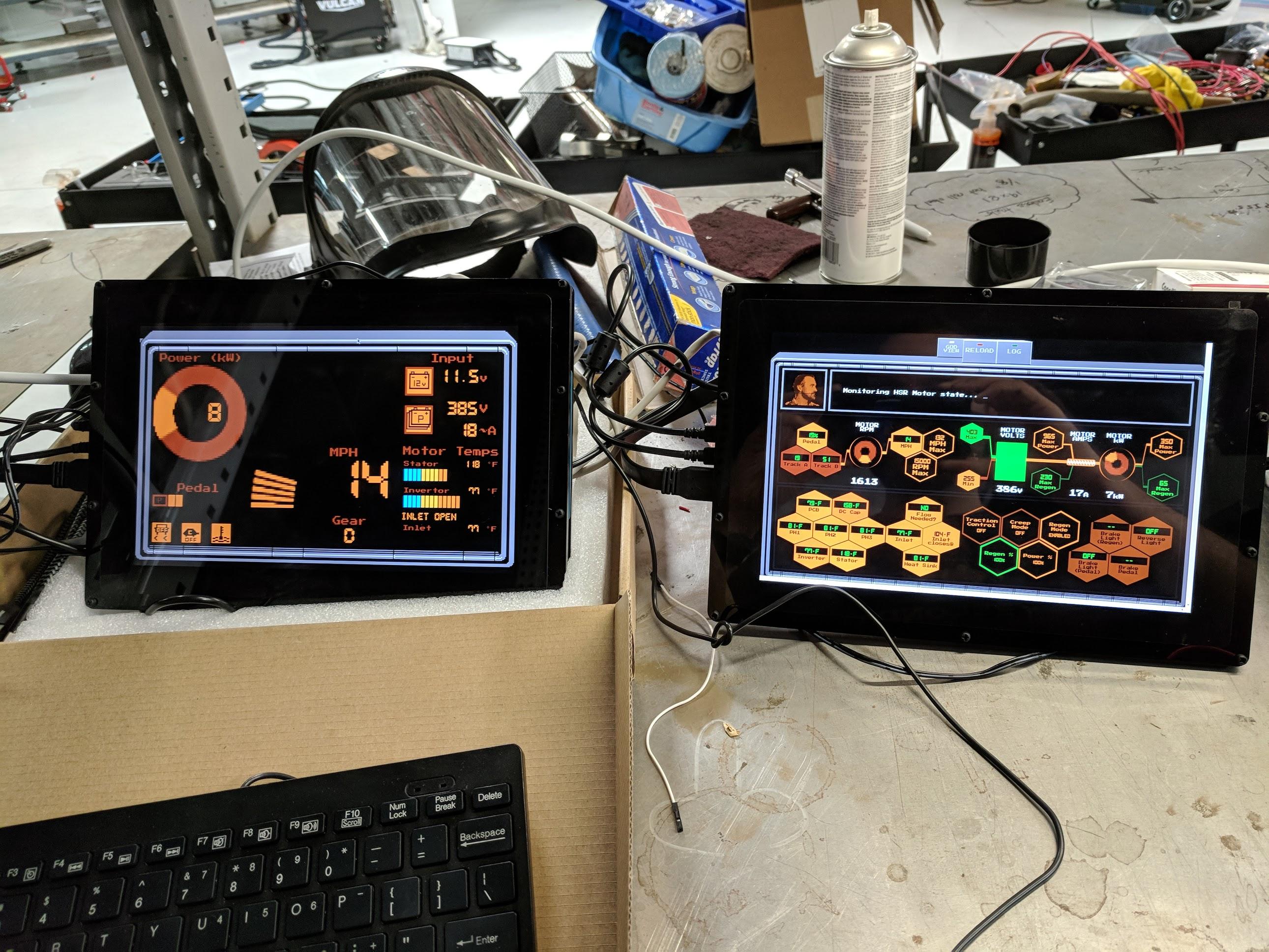 The first screen started out as a 7" display at 800x480. It was mostly designed to run using the HTML5 canvas. Later on, the second screen was a 10" display, at 1080x720. The routes used for this was mostly just css3 widgets.