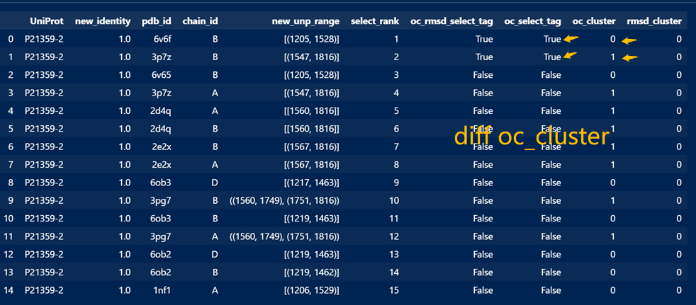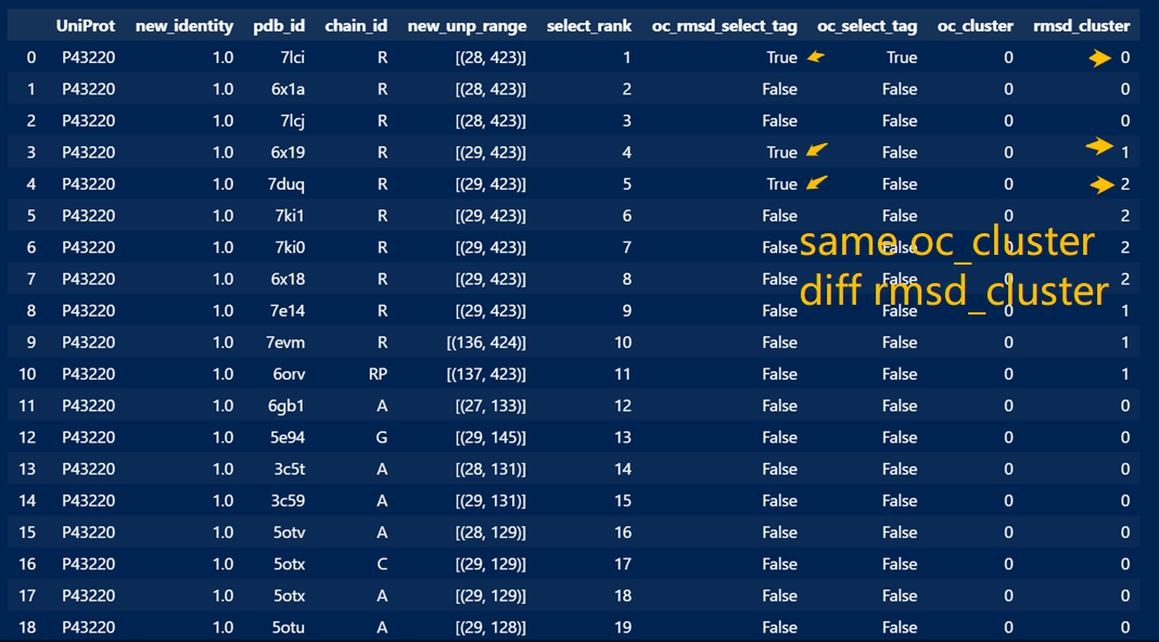 new_unp_range: the pdb chain's coverage region of the target UniProt isoformselect_rank: rank derived from sorting criteria (default:['bs_score', '1/resolution', 'revision_date', 'id_score'])oc_cluster: overlap coefficient based coverage (i.e. segment) cluster, each number represent a clusterselect_rank, iteratively compare the candidate chain with those chains in an existingoc_cluster, if not meet the cutoff with any existingoc_clusters, define a newoc_clusterrmsd_cluster: R.M.S.D based conformer cluster within a coverage clusteroc_cluster, follow theselect_rank, iteratively compare the candidate chain with those chains in an existingrmsd_cluster, if not meet the cutoff with any existingrmsd_clusters, define a newrmsd_clusteroc_select_tag: whether to include the chain into representative set that consider coverage onlyoc_clusteroc_rmsd_select_tag: whether to include the chain into the representative set that considers both coverage and conformersrmsd_clusterin the context of correspondingoc_clusterSwitch to