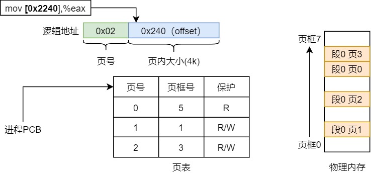 物理内存中的页成为物理页面或者页帧。虚拟内存的哪个页面映射到物理内存的哪个页帧是通过页表来描述的,页表保存在物理内存中,MMU会查找页表来确定一个虚拟地址应该映射到什么物理地址。