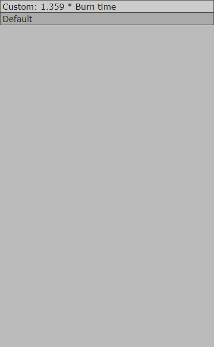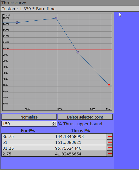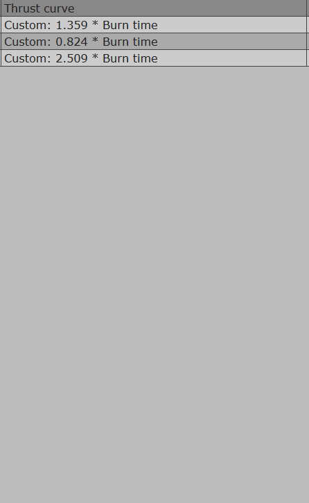Thrust curve column will now calculate, and display by how much your thrust curve will extend/shorten the engine burn time (Engines with internal tanks). 'Normalize' modifies the curve by changing the burn time multiplier to 1, while keeping the curve shape intact.