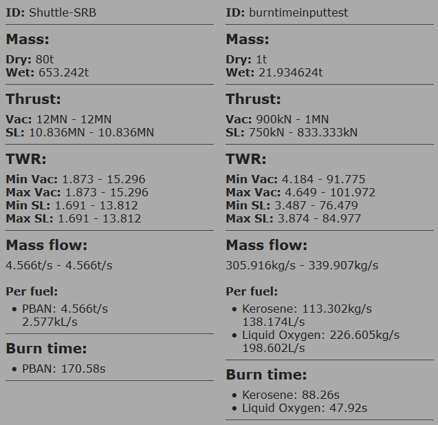 Infobox now displays mass flow both in total, and per propellant. Now infobox also displays expected engine burn time (Taking the thrust curve into consideration)