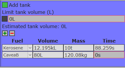 Now in addition to volume and mass, you can input tank contents by its propellant burn time. The field is only available when the engine uses the selected propellant. This field does take the current thrust curve into consideration