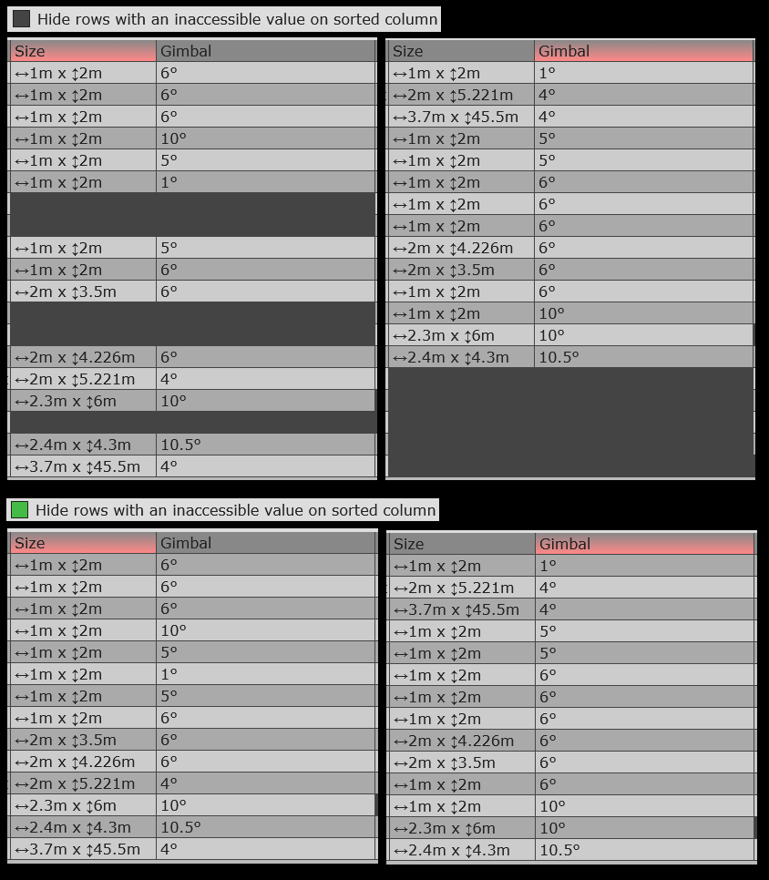 Inaccessible values will either try to assume their master's values, or be sorted as the highest value to filter them off. Rows with inaccessible sorting value are hidden by default. You can change this behaviour in settings.