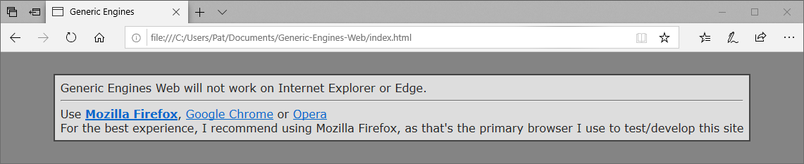 Launching the page on IE/Edge browsers will now show a message telling the user to use a real browser. The message might be broken on older IE's, because they sometimes won't run JS at all, until the user accepts JS in a prompt.