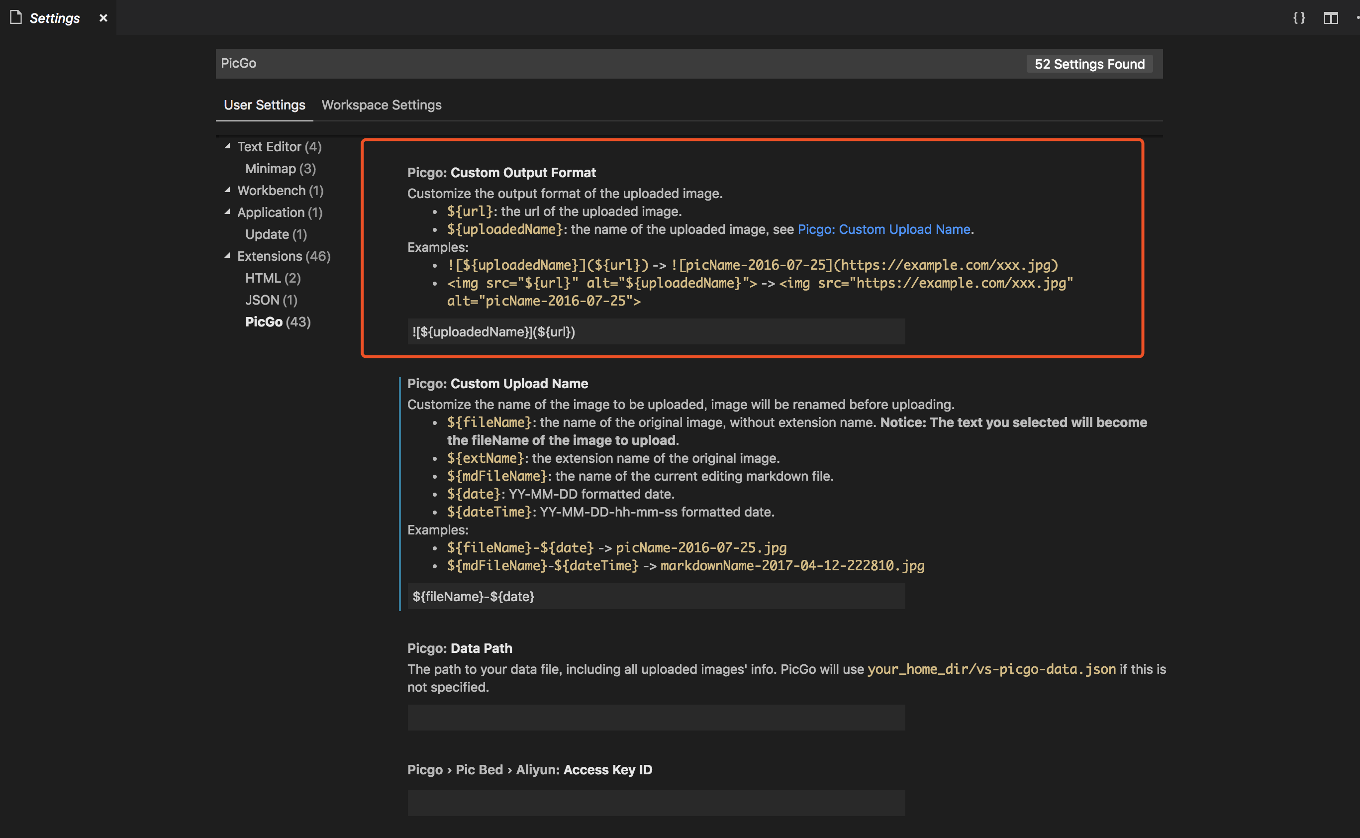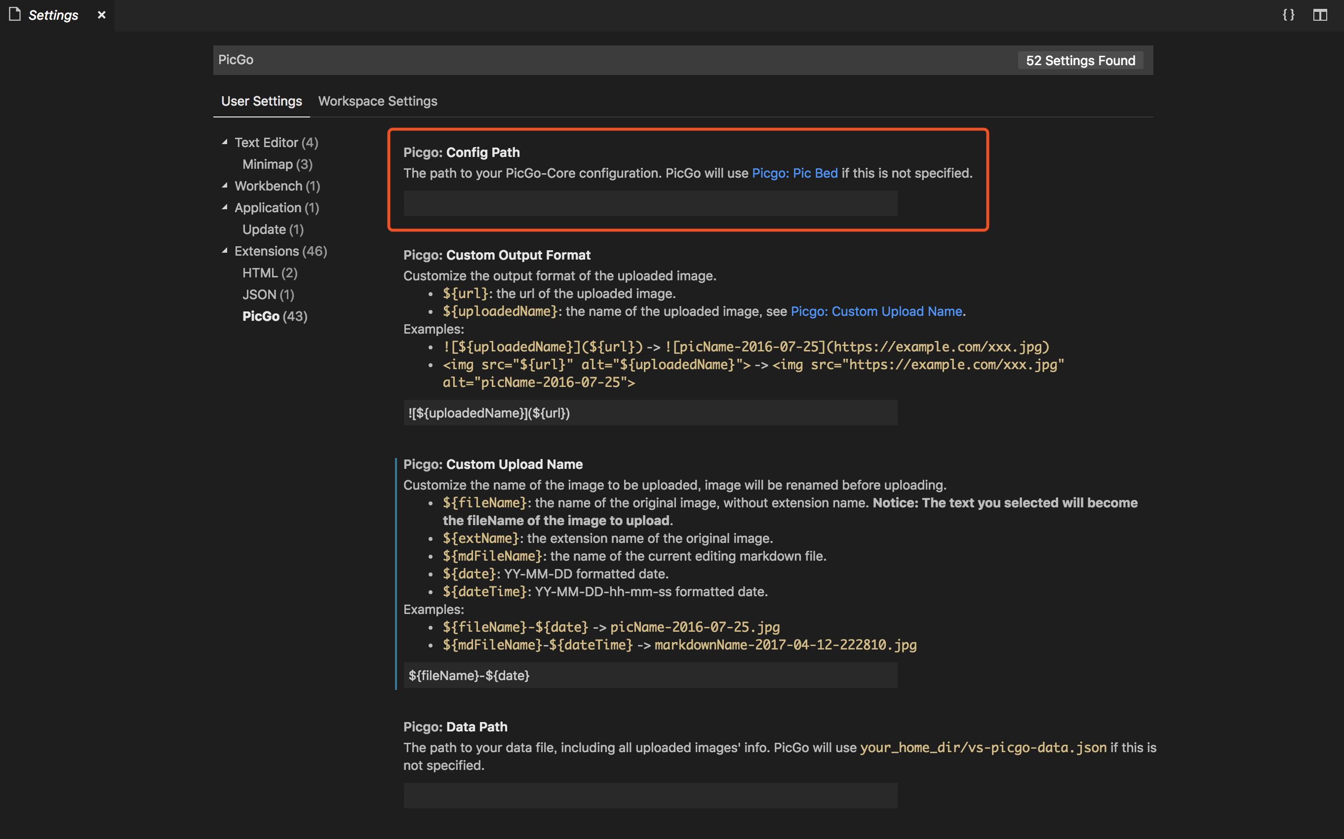 should be replaced by the path of your current user path.// Windows { "picgo.configPath":"YOUR_HOME_DIR\\AppData\\Roaming\\PicGo\\data.json", "picgo.dataPath": "YOUR_HOME_DIR\\AppData\\Roaming\\PicGo\\data.json" } // macOS { "picgo.configPath": "YOUR_HOME_DIR/Library/Application Support/picgo/data.json", "picgo.dataPath": "YOUR_HOME_DIR/Library/Application Support/picgo/data.json" } // Linux { "picgo.configPath": "YOUR_HOME_DIR/.config/picgo/data.json", "picgo.dataPath": "YOUR_HOME_DIR/.config/picgo/data.json" }
