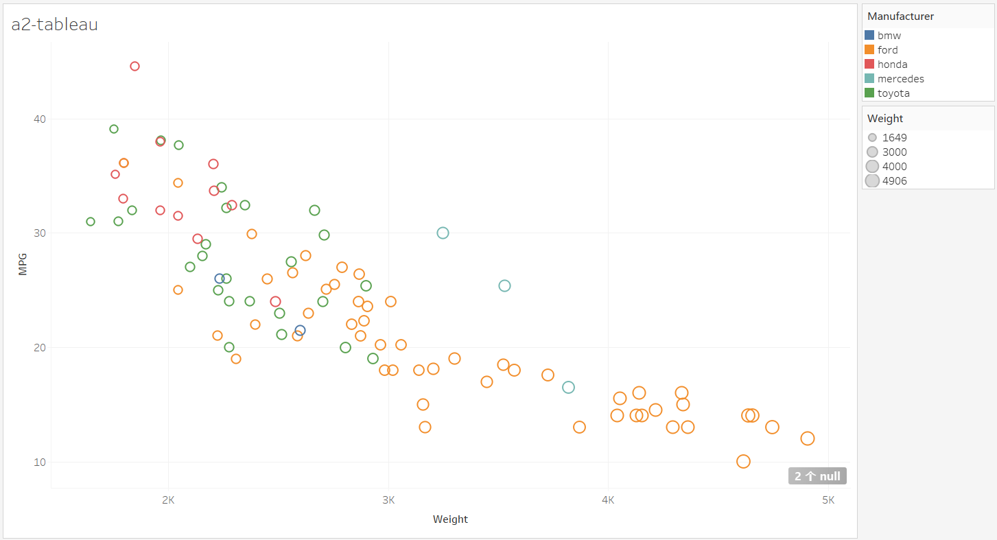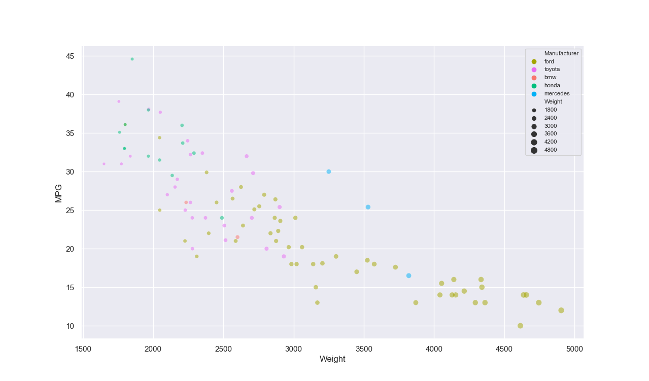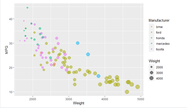 To visualized the cars dataset, I made use of ggplot2's geom_point() layer, with aesthetics functions for the color and size.