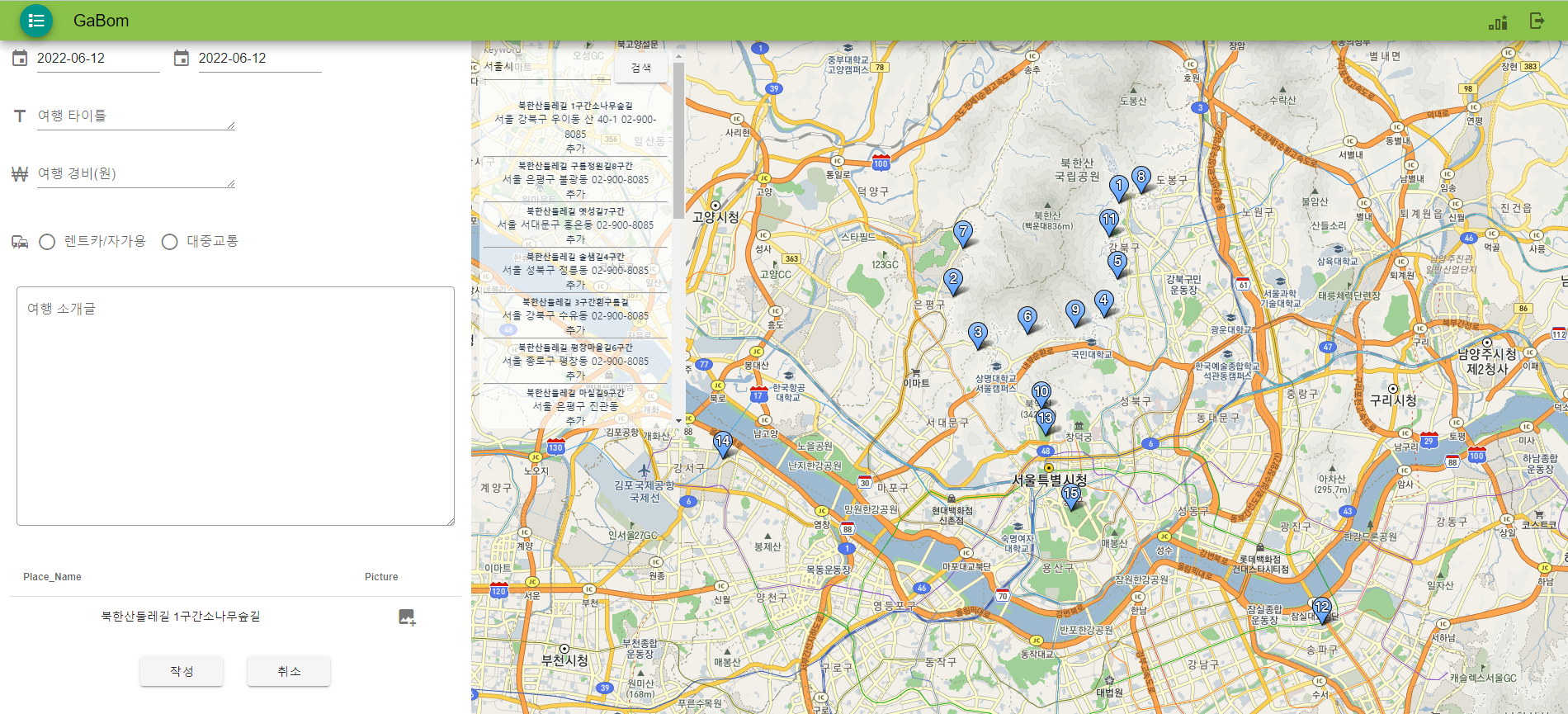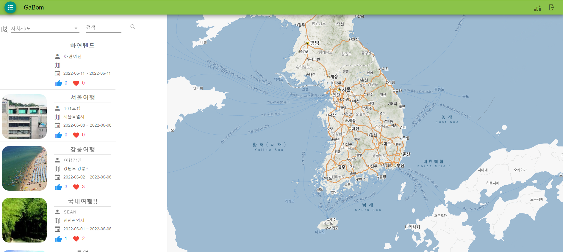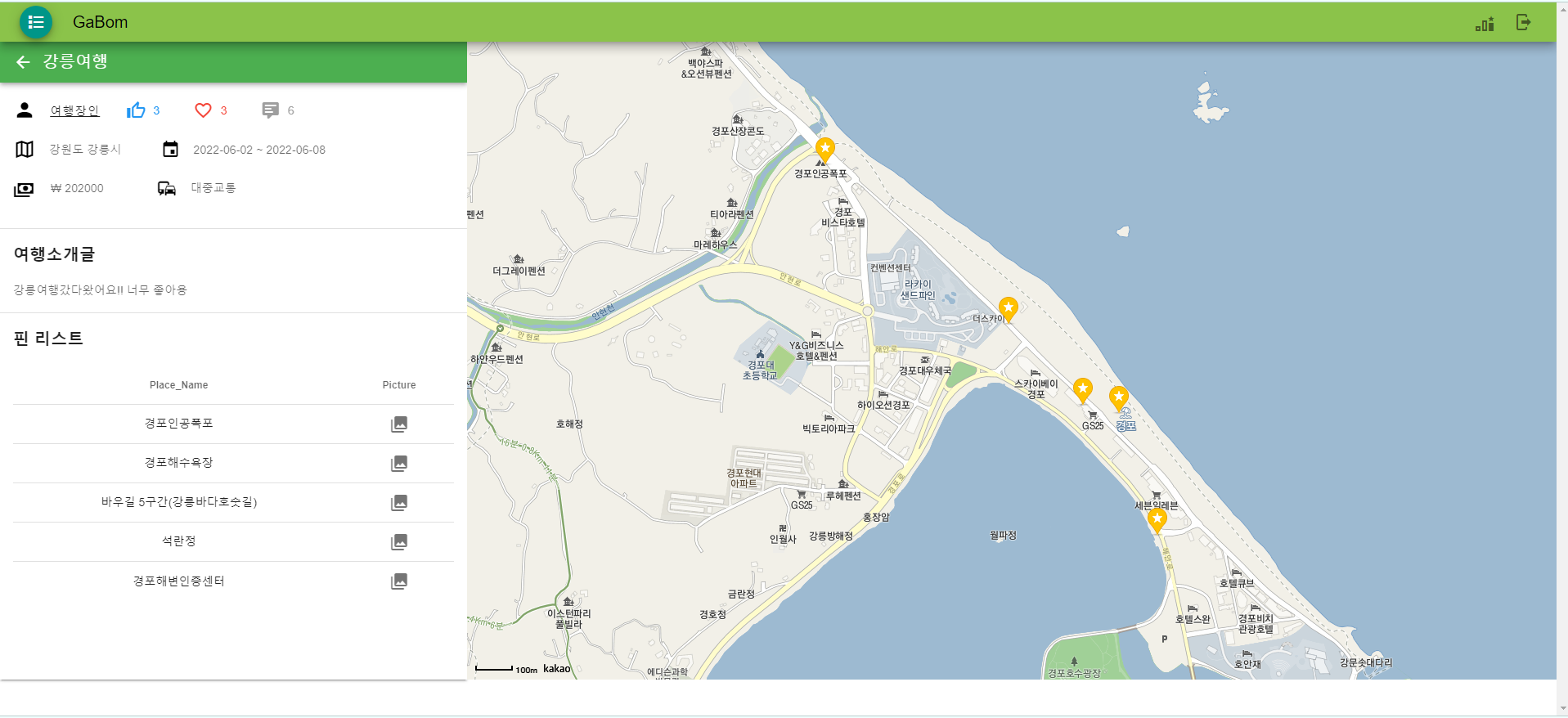 Gabom🍃 여행 리뷰 웹 프로젝트 가봄입니다. 여행 좋아하시나요? 가봄은 여행 계획을 짜기 앞서 다른 사람들의 여행 기록과 방문 장소를 찾아볼 수 있습니다. 1. Travel 탐색을 통해 다른 사람들의 여행 기록들을 모아 볼 수 있습니다. 2. travel 작성을 통해 나만의 여행 기록을 작성할 수 있습니다. 3. 마이페이지를 통해 내가 작성한 여행 기록들 또한 확인할 수 있습니다. 4. 여행 기록들의 모든 여행지 위치를 하나의 지도 안에서 확인할 수 있습니다.