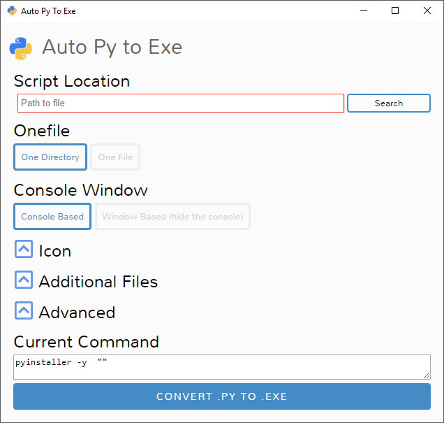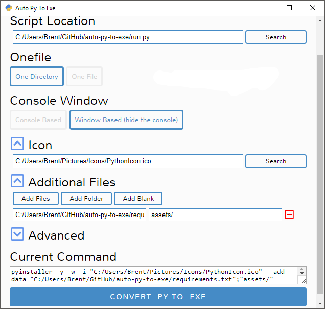 Now to run the application, execute python -m auto_py_to_exe. A Chrome window in app mode will open with the project running inside.