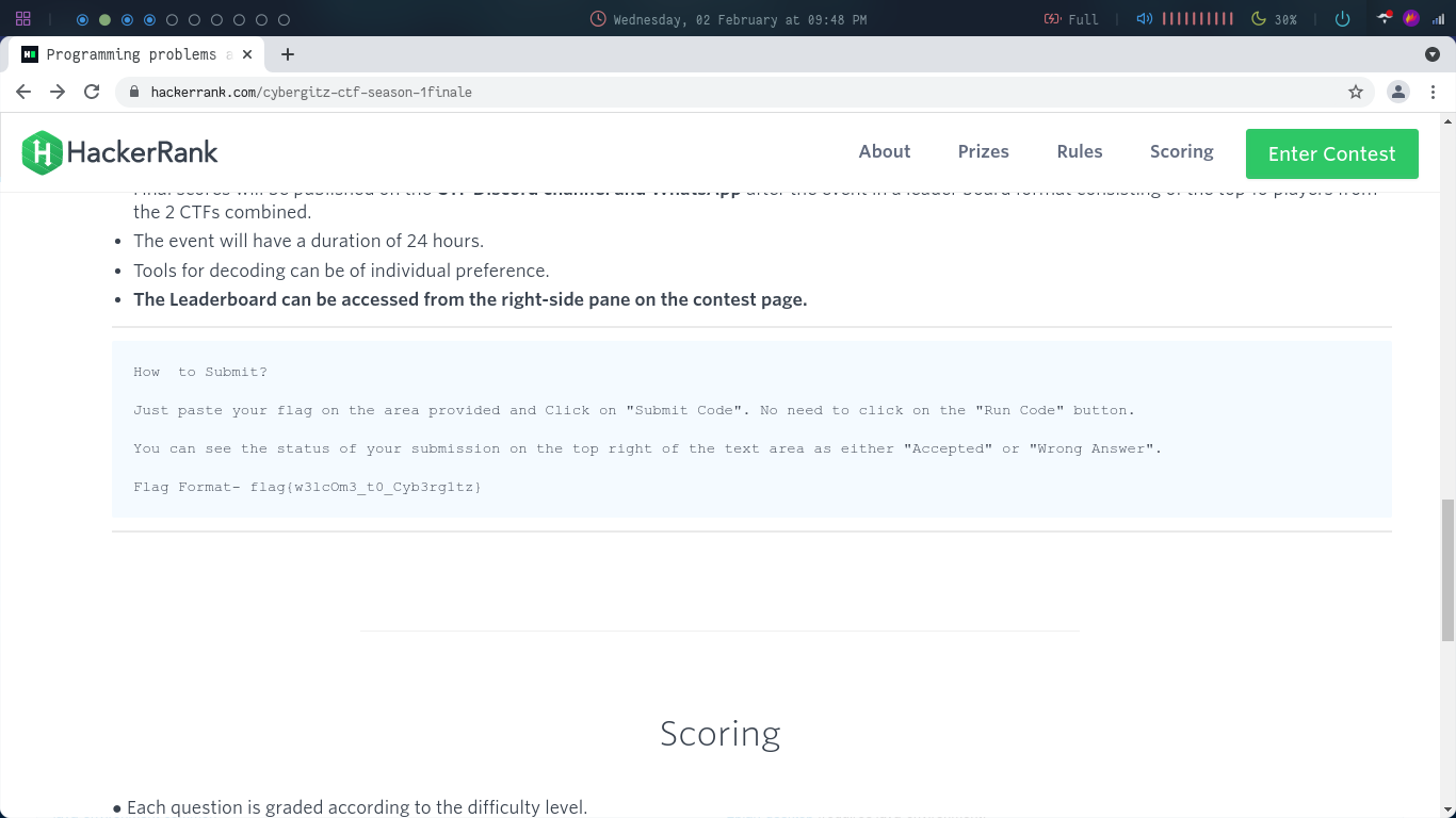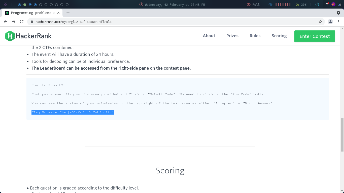 For this challenge nothing was given in the prompt but in the previous page if you read the rules, the flag format was given which is basically the flag for the first question.The highlighted in the last image is the required flag.