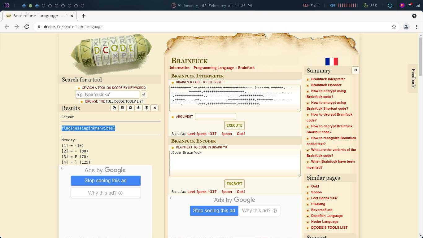 This question comes under the cryptography section. On analysing the given cipher it turned out to be a "Brainfuck" code and on executing it we get the following:The highlighted text on the left is the required flag.
