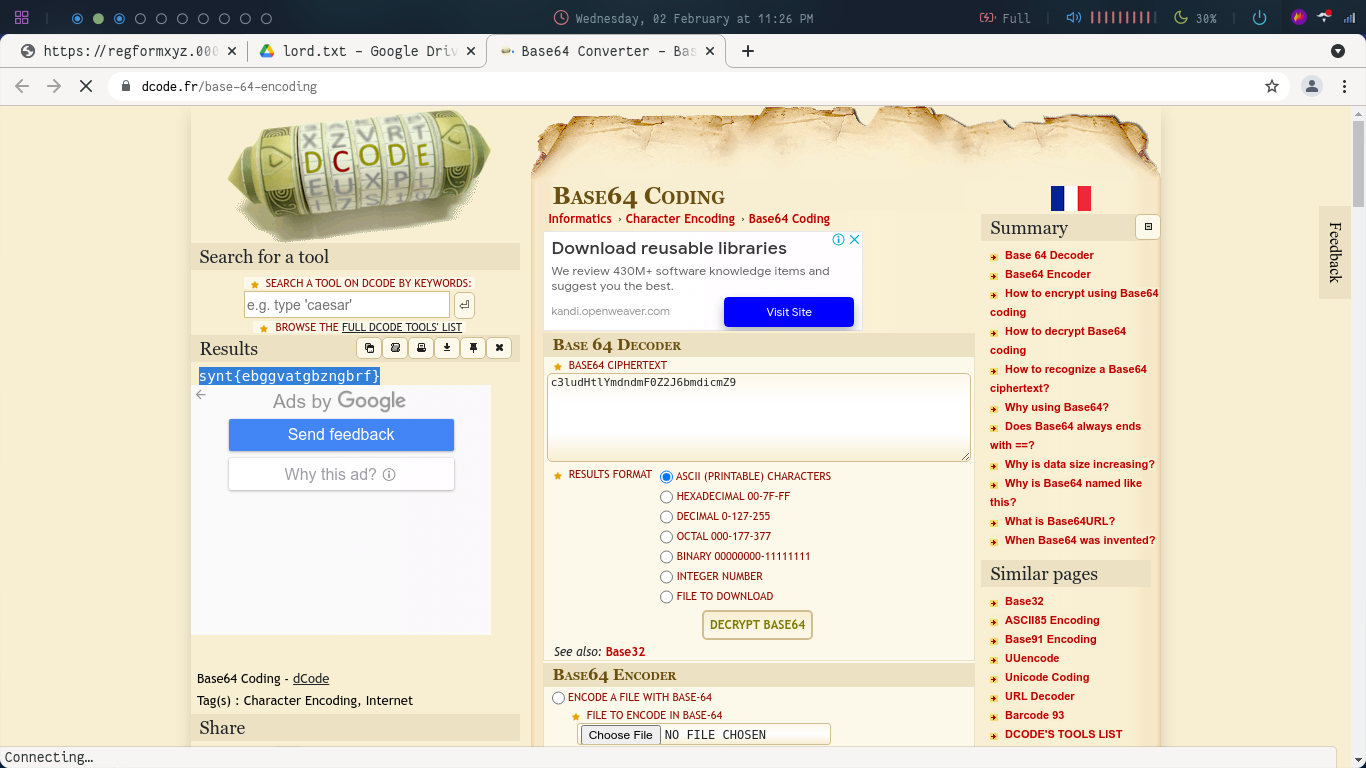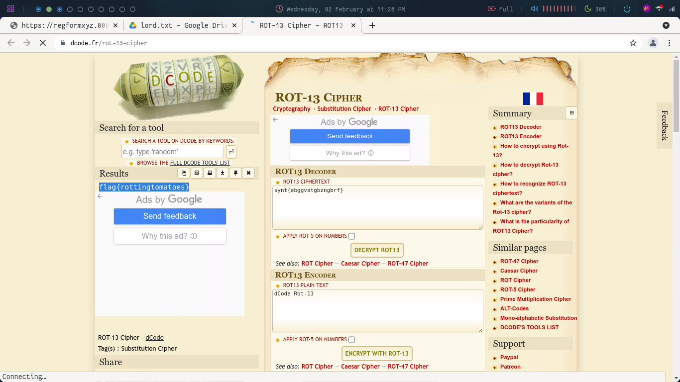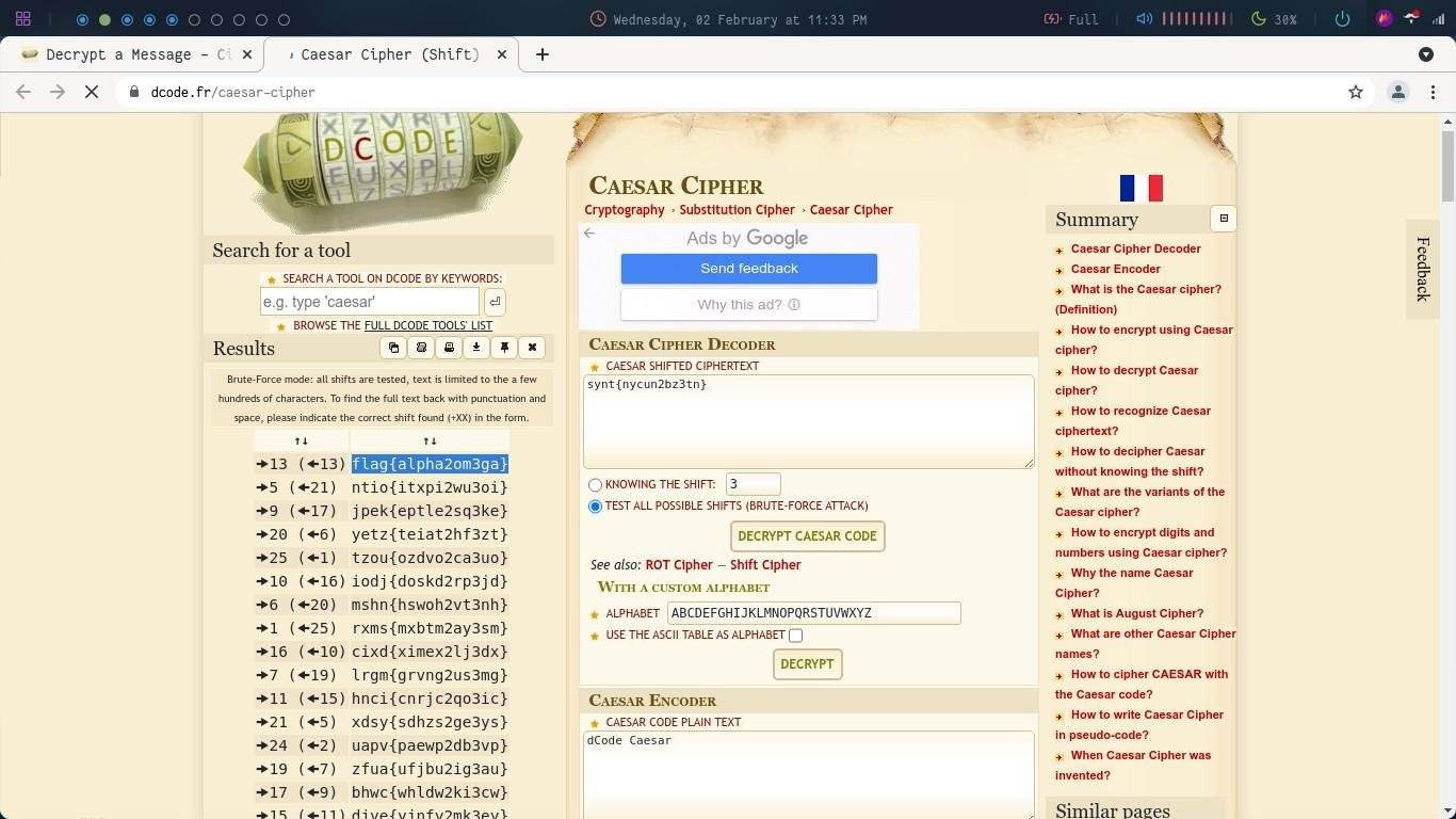 The result (highlighted on the left) again seems to be a cipher. On checking it seems like it is a ROT13 cipher. Let’s decode it again:
