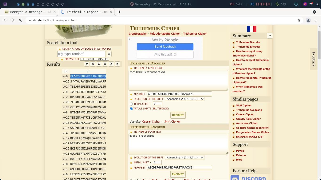 This question comes under the cryptography section and the given is a cipher: `fmcj{xmkuivotewcwqefxm}`On analysing it we find it to be a Trihemius cipher. Let’s decode it: