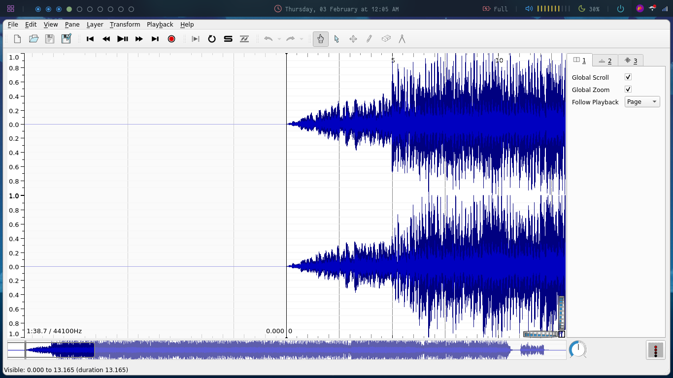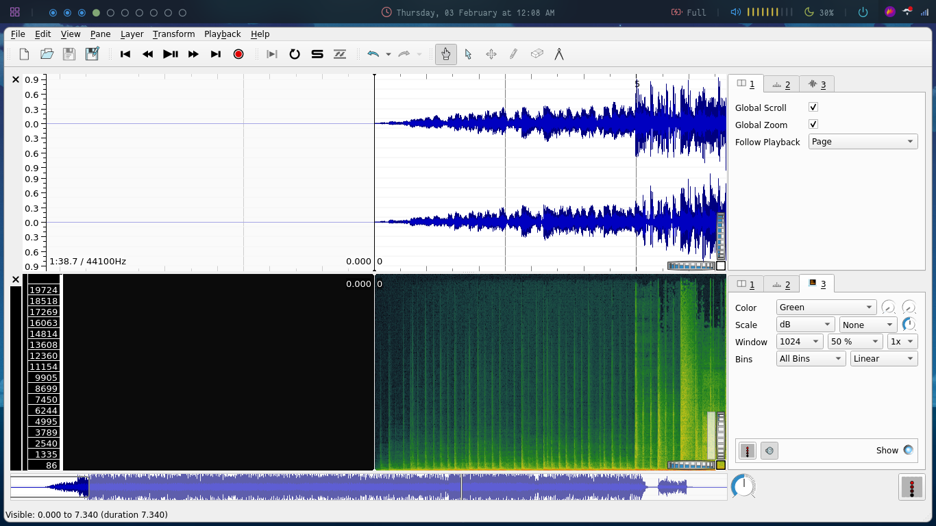 After opening it add a spectrogram for the audio by going to Pane -> Add spectrogram -> Mix by audio-joiner.com: All channels Mixed