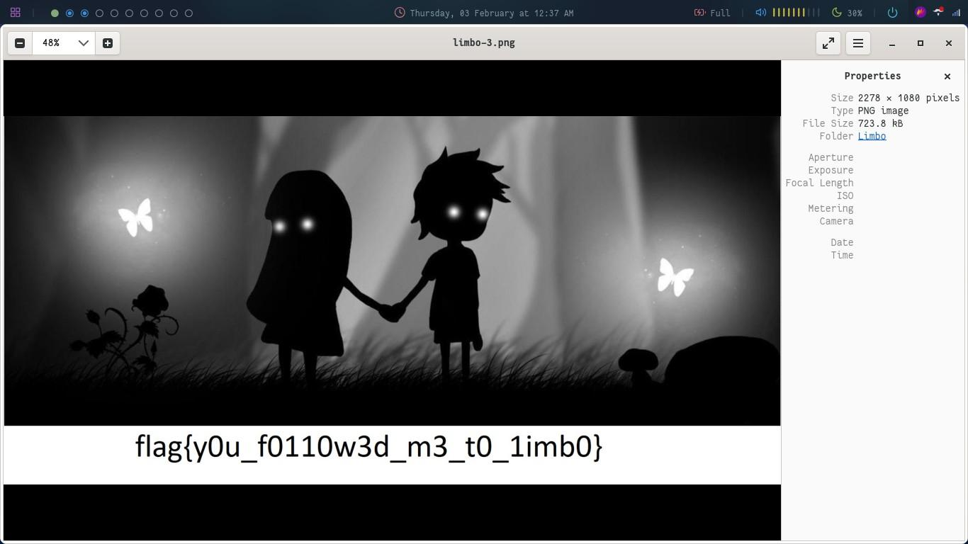 This question comes under the steganography section. We are provided with an image from the game called Limbo:The given file is in .tif format. Converting it to a .png format gives us 7 additional images other than the original: