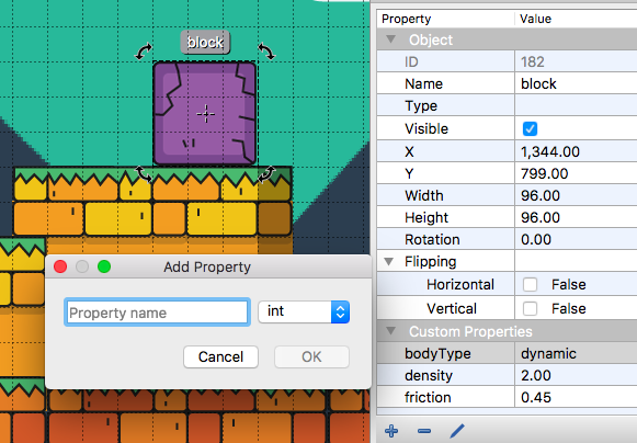 The most exciting part of working in Tiled & Solar2D is the idea of custom properites. You can select any image object or tile object on any object layer or tile layer in Tiled and add any number of custom properties. ponytiled will apply those properties to the image object as it loads. This allows you to put physics properties, custom draw modes, user data, etc. on an in-game item via the editor.