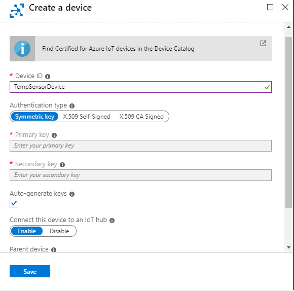 - Navigate inside the hub menu > IoT Device > Add > and fill the following fields: **DeviceId — **name of the device, Authentication type — type of Authenticationchoose the symmetric key(aka SAS) and leave the auto generate keys checked, and enable the connect this device to IoT hub.