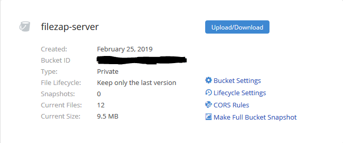- Create a bucket called filezap-server, make it private and save your bucket id as BACKBLAZE_BUCKET_ID