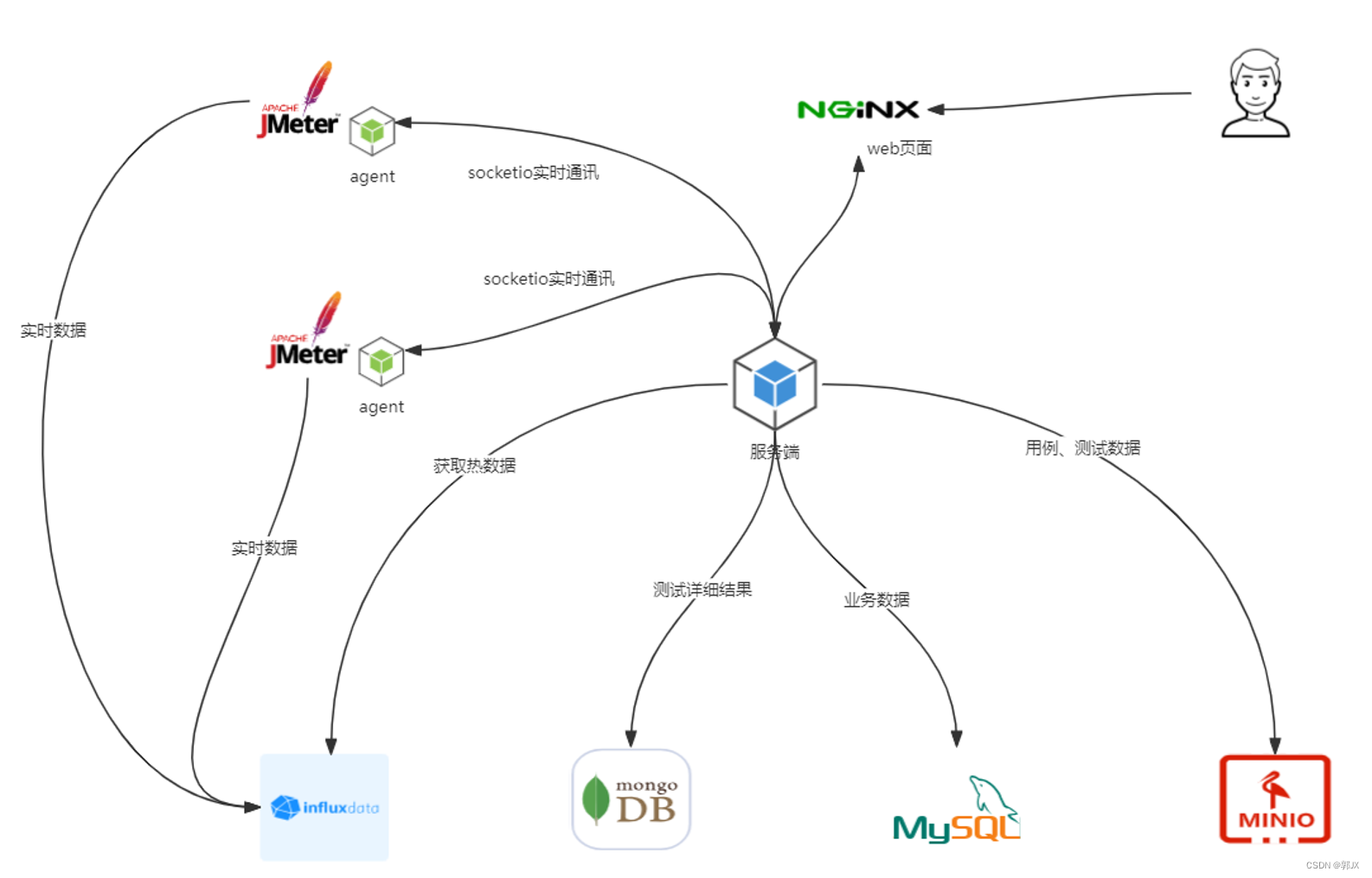 用户访问web页面,再由页面通过http请求访问业务后端服务。每台压力机服务器(只支持linux)上有且仅有一个jmeter,同时安装一个agent来控制jmeter运行,agent和服务端使用socketio实时通讯,用于服务端下发指令和agent上报状态。业务数据使用mysql进行存储,测试结果的详细数据使用mongodb存储,压测过程中的热数据使用influxdb存储,测试用例脚本、压测数据文件和压测结果文件(日志、jtl、报告)使用minio文件服务器存储。