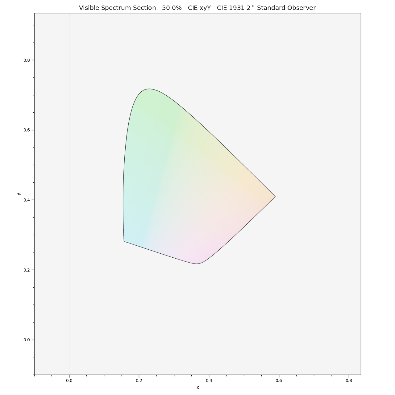 (<Figure size 640x640 with 1 Axes>, <Axes: title={'center': 'Visible Spectrum Section - 50.0% - CIE xyY - CIE 1931 2$^\\circ$ Standard Observer'}, xlabel='x', ylabel='y'>)
