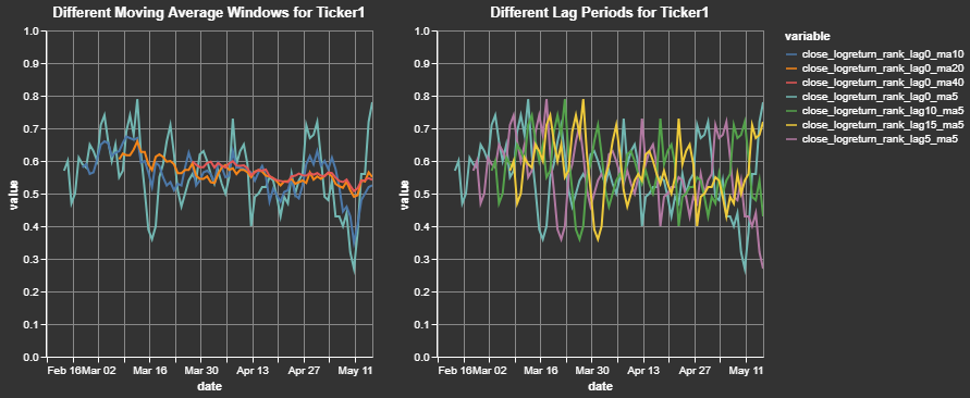 )We can take a closer look at a sample output for a single ticker and for a single initial feature. This clearly shows how the close price for a cross-sectional dataset is transformed into a log return, ranked (between 0 and 1) by date, and smoothed (moving average windows) by ticker:
