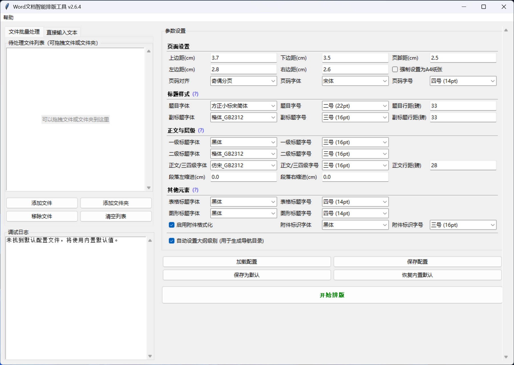 - 参数自定义:所有核心参数(页边距、字体、字号、行距等)均可在界面调整。配置方案可保存和加载。