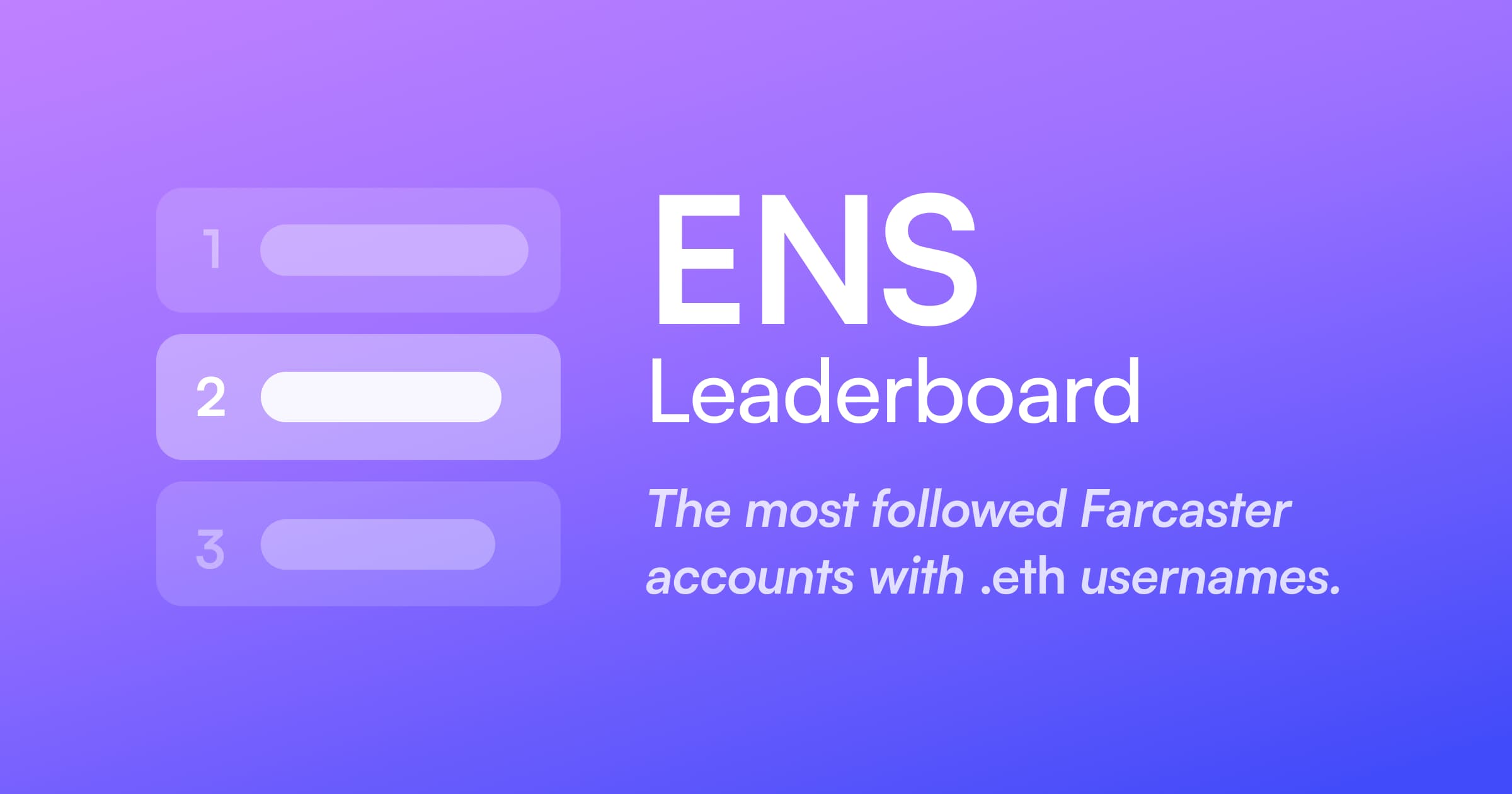 ensLeaderboard A leaderboard of the most followed ENS names on Farcaster, powered by Farcaster Kit To run the leaderboard locally: Install dependencies: npm install Start the app: npm run dev Built by limes.eth and dylsteck.eth