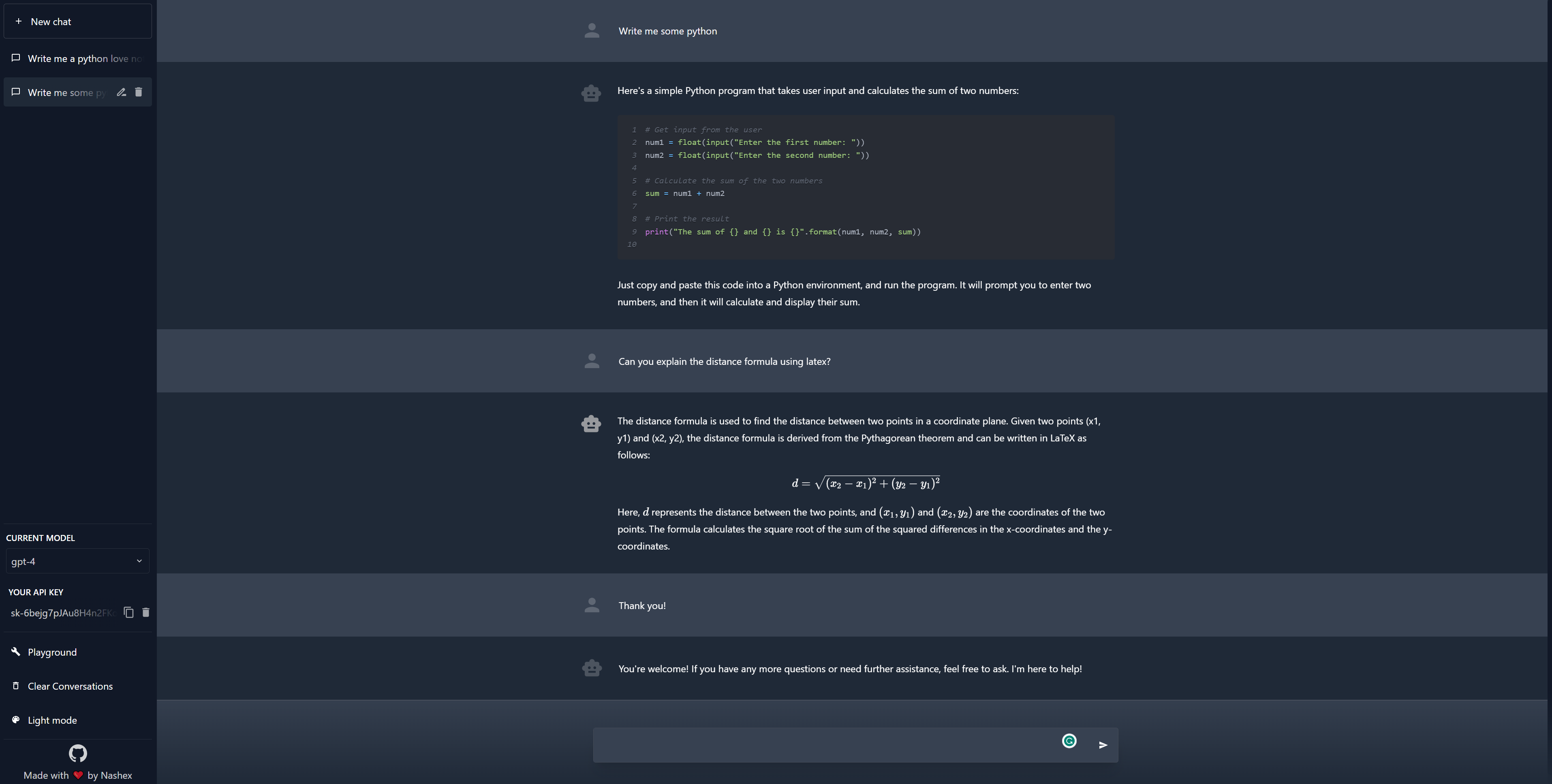 This environment has most of the critical features like conversation history (which is stored locally), prompting, and multiple conversations. This environment is a great way to test out your API key and see how it works!