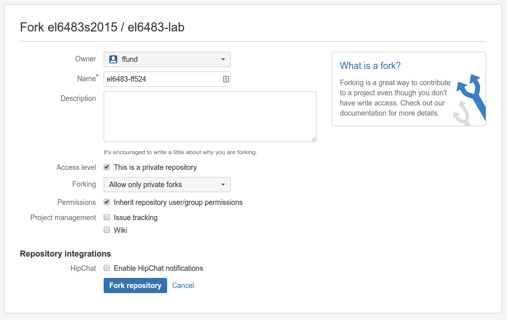 Please use el6483-netID (with your own Net ID) as the name for your fork, make your repository private (at least for the duration of this course), and check the box to "Inherit repository user/group permissions." Since we're using git to receive and grade your lab submissions, it's important that you set it up correctly: