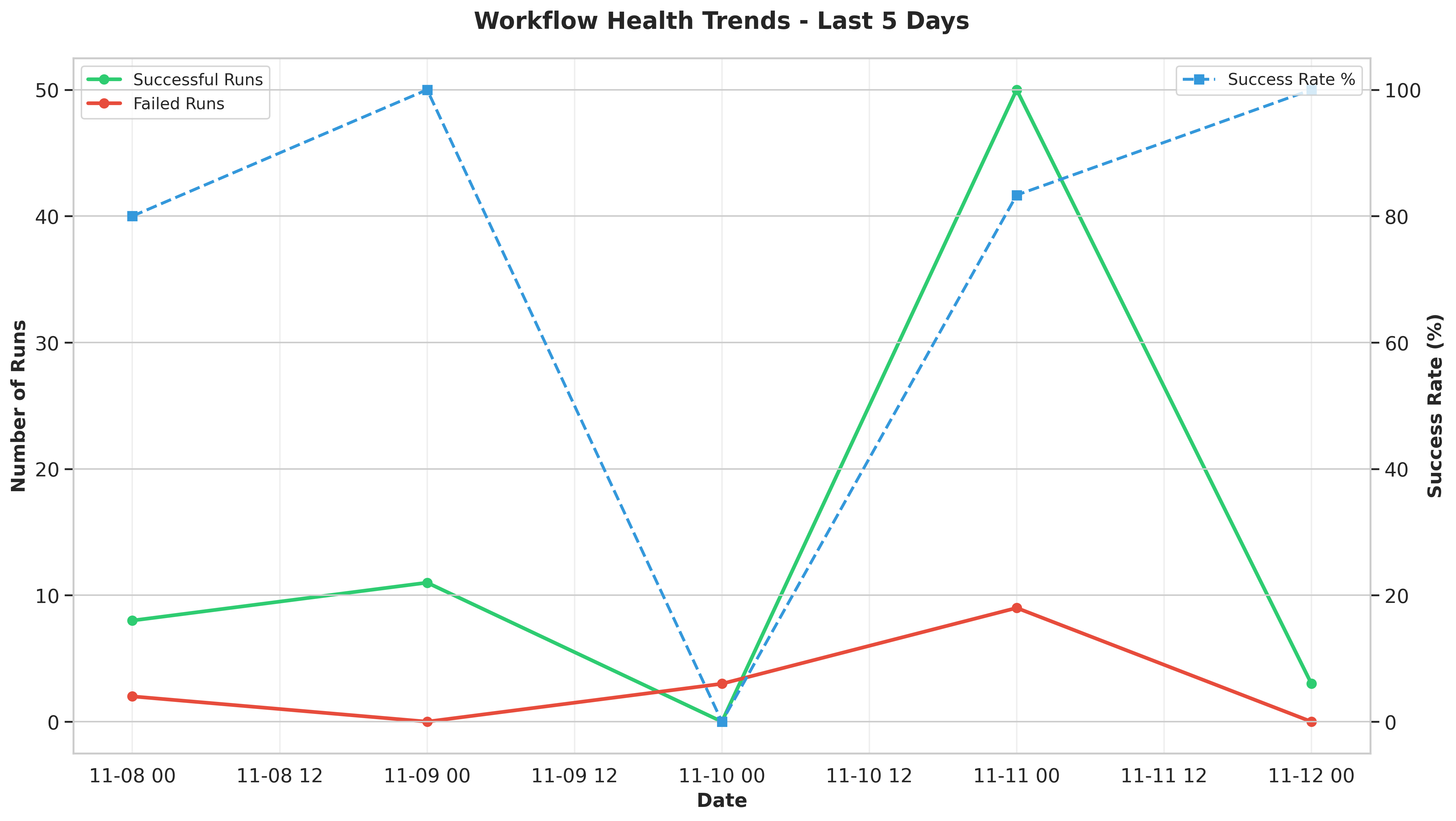 The chart shows workflow execution patterns over the past 5 days. Success rates remain relatively stable around 80-85%, with November 11 showing the highest success count (42 runs). The failure rate has been consistent, averaging 2-3 failed runs per day.