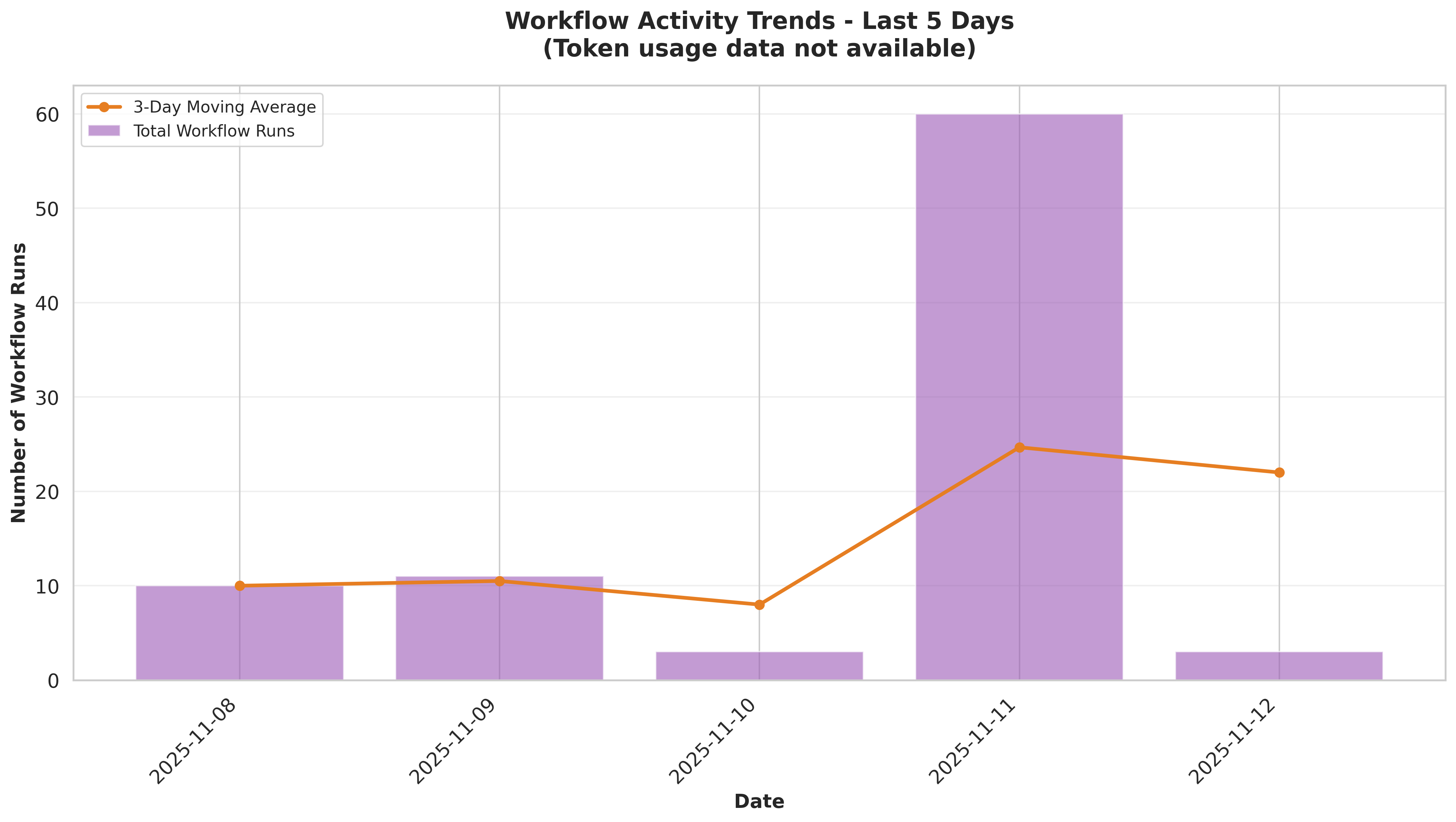 Workflow activity shows steady utilization with November 11 having the highest activity (49 total runs). The 3-day moving average indicates consistent workflow usage without major spikes or drops. Note: Token usage data is not currently being captured in workflow metrics.