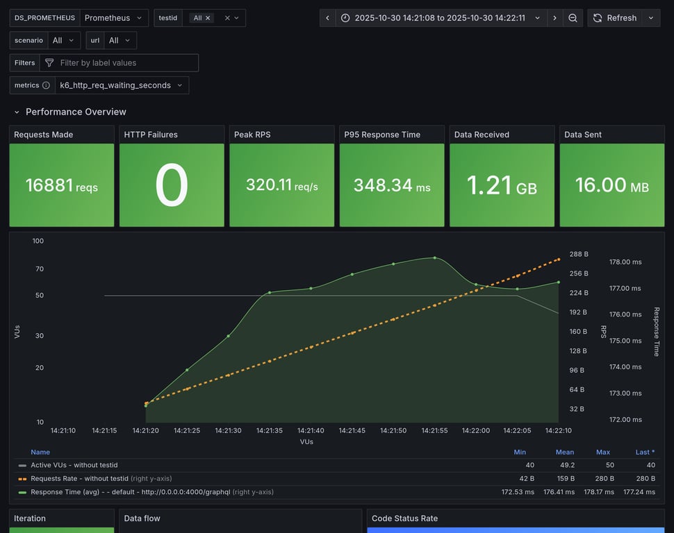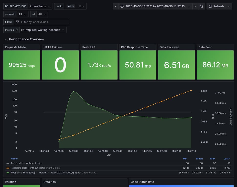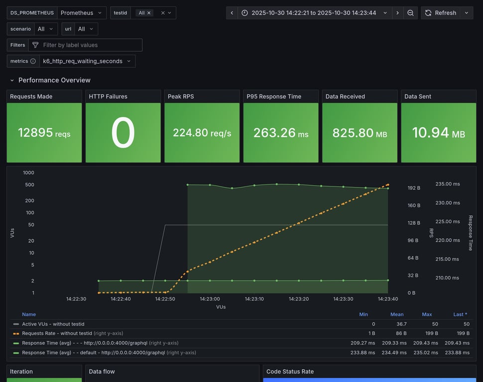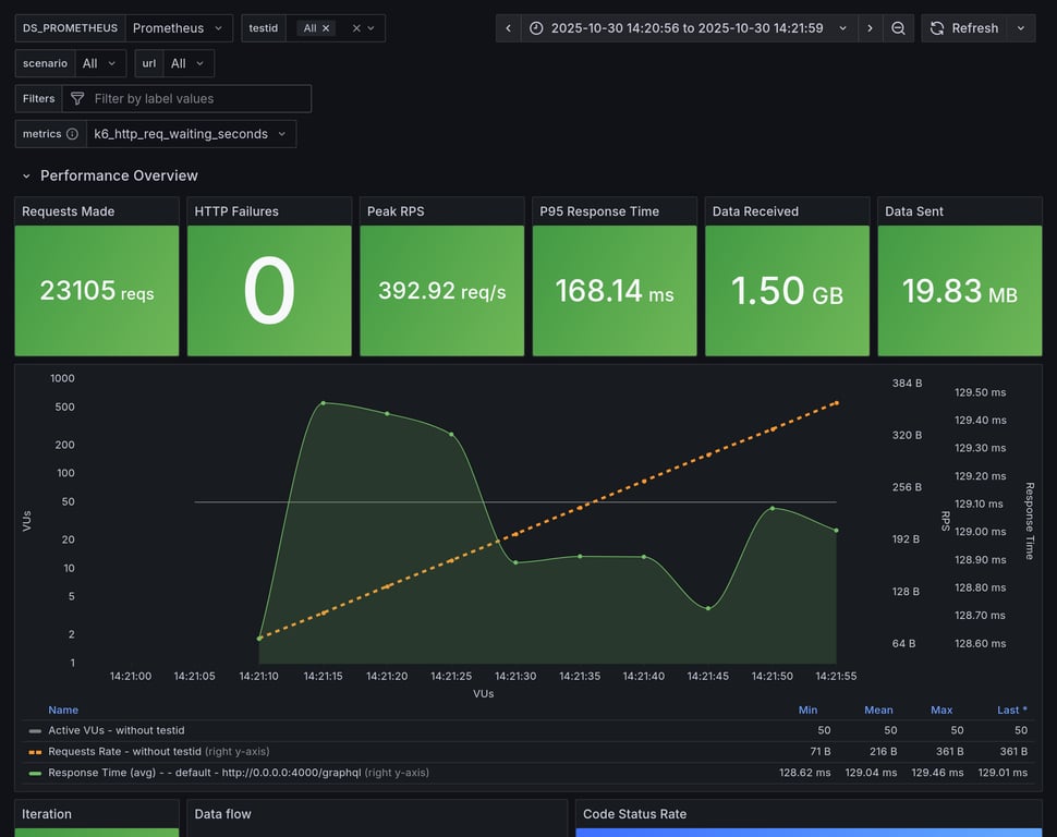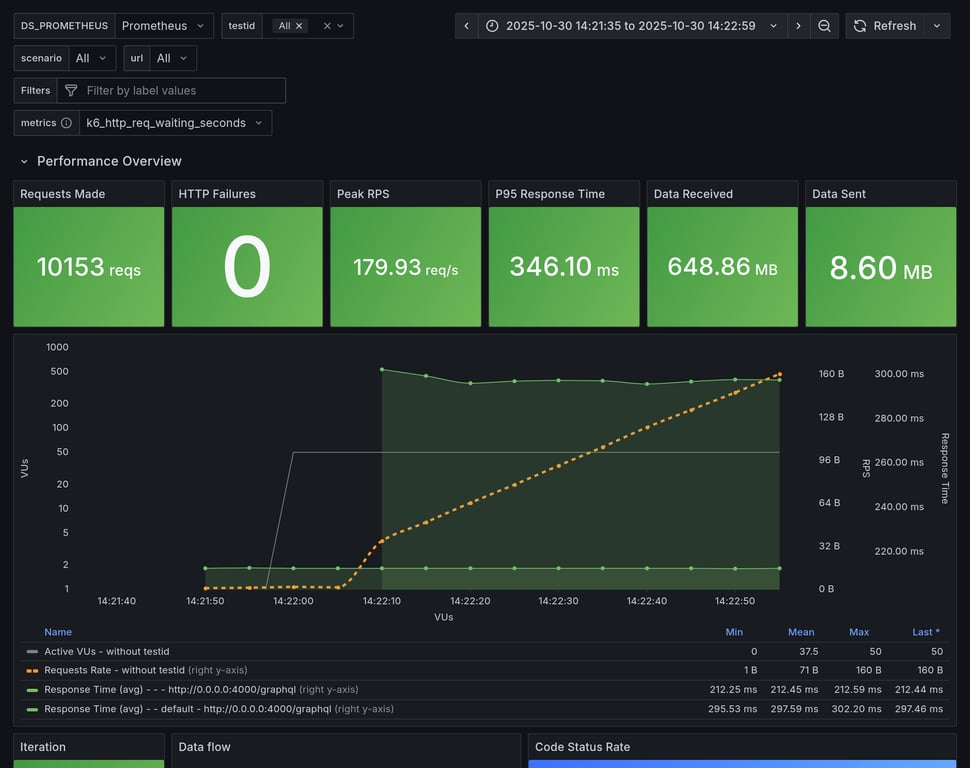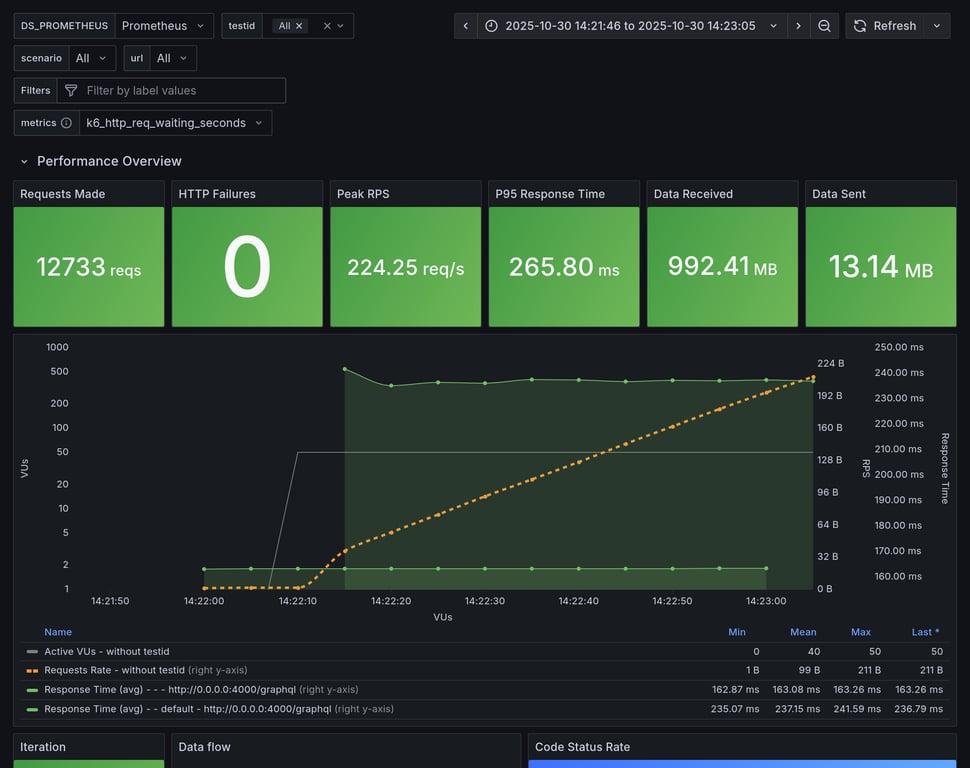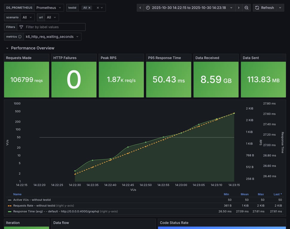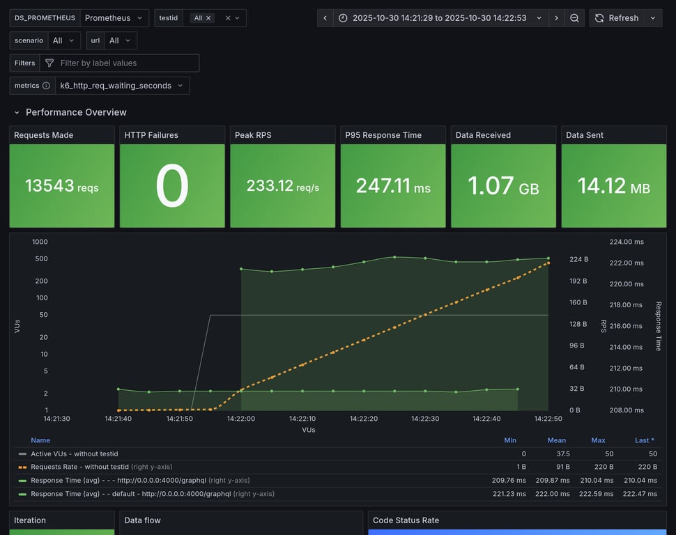 | apollo-router | 388 | 26140 total, 0 failed | avg: 540ms, p95: 1216ms | ❌ 18 unexpected GraphQL errors |