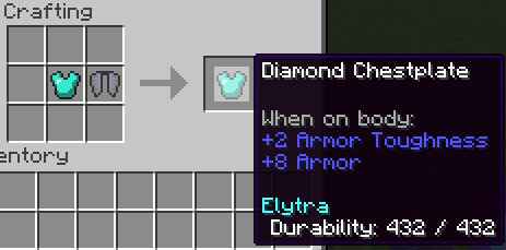 - Normal: The chestplate and elytra exist separately. They each retain their own enchantments and flight will drain the elytra's durability as normal. The elytra component can be repaired using Phantom Membrane in the anvil as normal, along with the approrpriate prior work penalties. Separation is possible by placing the colytra in a crafting grid again.