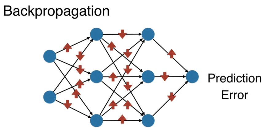 First taking data point and perform forward pass, calculate prediction and calculate error based on log loss, take the derivative of the error based on all weight using chain rule to tell us how much to obtain each weight in order to best decrease the error (gradient descent). Plot the error and calculate gradient which is the direction of greatest growth and then take a tiny step in the direction of negative of this gradient in order to find new parameter that decrease error as much as possible.