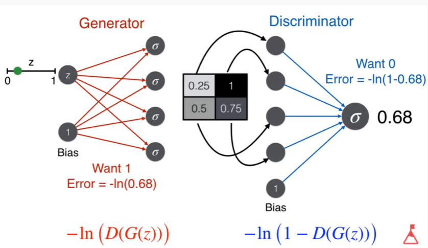 Since the number is random and not face and the image generated by generator, the discriminator should saying is fake (want Output 0). The generator want to generate an image so good so that discriminator classifies as real (want output 1). That both error function helps to train the neural network. The derivatives of both help to update weights of both neural network. The two error functions are fighting each other but is okay because red error function is changing the generator weigths and blue error functions is changing the discriminator weights therefore they dont coliide and simply improve both neural networks.