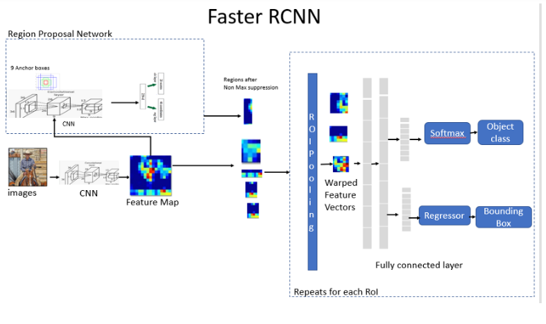 3.Detection Network is the R-CNN which takes input as the feature maps from the convolutional layer and the RPN network. This generates the bounding boxes and the class of the object.