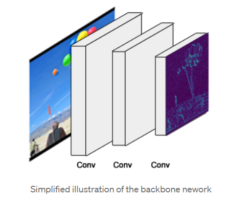 This is a standard convolutional neural network (typically, ResNet50 or ResNet101) that serves as a feature extractor. The early layers detect low level features (edges and corners), and later layers successively detect higher level features (car, person, sky).
